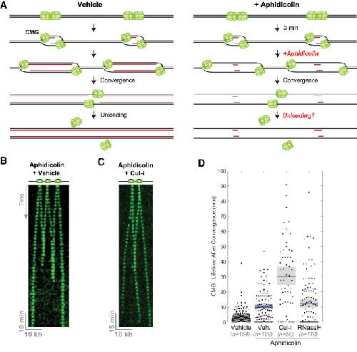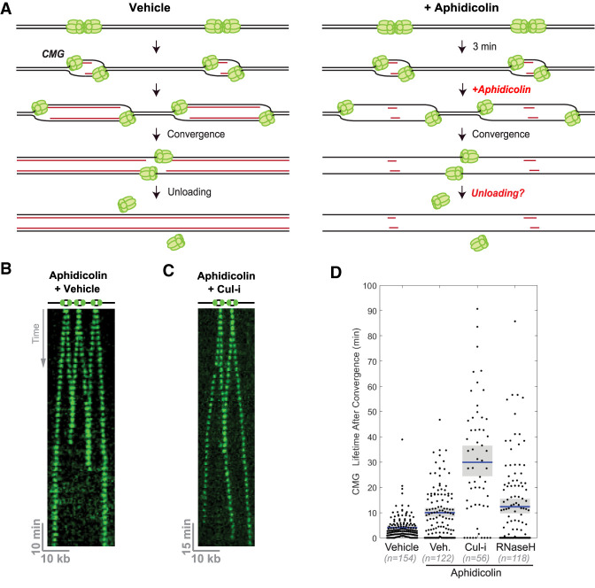 Figure 3. CMG unloading does not require encounter with dsDNA. (A) Schematic of replication termination in the presence or absence of aphidicolin, which inhibits all replicative polymerases. Short red lines in the panel at the right represent limited nascent strand synthesis that occurs before addition of aphidicolin. Without DNA synthesis, replisomes converge without CMG encountering dsDNA, as shown at the right. (B) λ DNA was replicated as in Figure 2A, but in the presence of aphidicolin. (C) Same as B, but extracts were supplemented with Cul-i. (D) Quantification of CMG lifetime after convergence in the presence or absence of aphidicolin, Cul-i, or RNase H. (Blue bar) Mean, (gray boxes) 95% confidence interval estimated by bootstrapping. Values are reported in Supplemental Table S1.