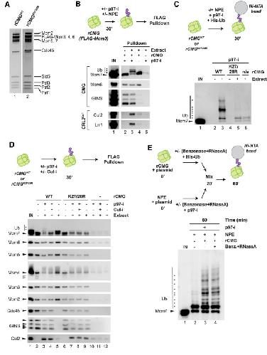 Figure 4. Recombinant CMG undergoes Mcm7 ubiquitylation in extract in the absence of DNA. (A) rCMG and rCMGK27/28R visualized with SYPRO Ruby stain. (B) rCMG from A was incubated in NPE or buffer in the presence or absence of p97-i, and then recovered using anti-FLAG resin and blotted for the indicated proteins. (C) rCMG and rCMGK27/28R from A were incubated in buffer or NPE in the presence of p97-i and His-tagged ubiquitin (His-Ub). Ubiquitylated proteins were isolated with Ni-NTA resin and immunoblotted for Mcm7. (D) rCMG and rCMGK27/28R from A were incubated in buffer or NPE in the presence or absence of p97-i or Cul-i, CMG and associated proteins were isolated on anti-FLAG resin, and the samples were immunoblotted with the indicated antibodies. (Gray arrowheads) Degradation products of Mcm4. (E) rCMG supplemented with His-Ub was treated with 2 U/µL benzonase and 2.5 µg/µL RNase A for 20 min. Simultaneously, NPE supplemented with p97-i was treated with benzonase and RNase A for 20 min. Both NPE and rCMG samples were supplemented with a 5.4-kb plasmid to verify the efficiency of benzonase treatment. The two treated samples were mixed together and incubated for a further 40 min. At that point, His-ubiquitin pull-down was performed, followed by immunoblotting with Mcm7 antibodies. Samples were also removed at the 20- and 60-min time points for DNA analysis (Supplemental Fig. S5A).