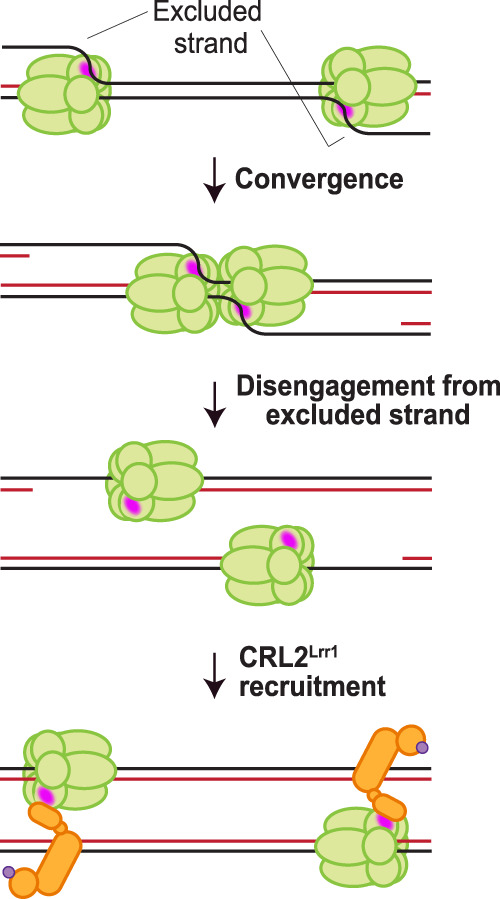 Figure 6. A model for the regulation of CRL2Lrr1 recruitment. During elongation, the excluded strand interacts with a surface of CMG (pink patch) or an associated replisome subunit that normally interacts with CRL2Lrr1, precluding binding of the ligase. Upon convergence of two CMGs during termination, the last parental duplex is unwound, and the excluded DNA strand disengages from the outer surface of CMG, allowing CRL2Lrr1 recruitment.