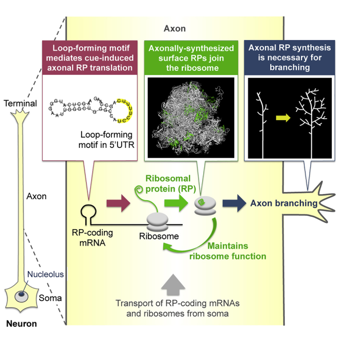 Ribosome assembly occurs mainly in the nucleolus, yet recent studies have revealed robust enrichment and translation of mRNAs encoding many ribosomal proteins (RPs) in axons, far away from neuronal cell bodies. Here, we report a physical and functional interaction between locally synthesized RPs and ribosomes in the axon. We show that axonal RP translation is regulated through a sequence motif, CUIC, that forms an RNA-loop structure in the region immediately upstream of the initiation codon. Using imaging and subcellular proteomics techniques, we show that RPs synthesized in axons join axonal ribosomes in a nucleolus-independent fashion. Inhibition of axonal CUIC-regulated RP translation decreases local translation activity and reduces axon branching in the developing brain, revealing the physiological relevance of axonal RP synthesis in vivo. These results suggest that axonal translation supplies cytoplasmic RPs to maintain/modify local ribosomal function far from the nucleolus in neurons.