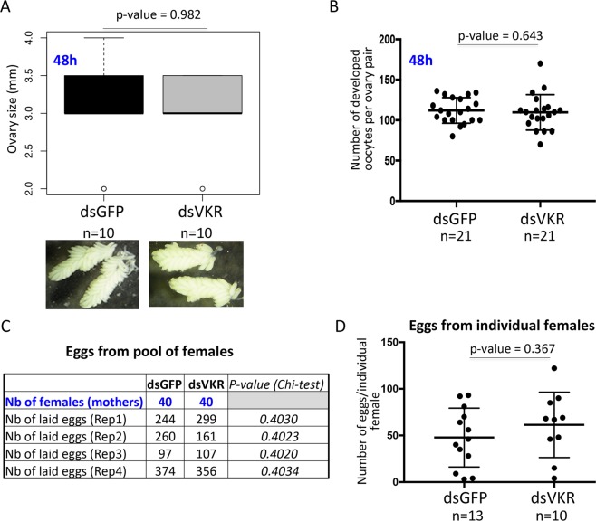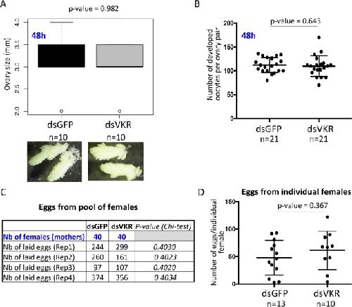 Figure 3. VKR does not affect A. coluzzii ovary structure and fecundity. (A) Median size and structure of A. coluzzii ovaries from dsGFP and dsVKR females at 48âh post-blood meal are not significantly different. (B) Median numbers of developed oocytes per ovary pair from dsGFP and dsVKR females at 48âh post-blood meal are not significantly different. The Differences in ovary sizes and in the number of developed oocytes between the two groups were tested using non-parametric Wilcoxon Mann-Whitney. (C) Eggs from pools of females: VKR has no effect on the number (Nb) of laid eggs reported to the number (Nb) of females (mothers) in four independent experiments (Chi-square p-valueâ>â0.05). The number of female mothers for each group (dsGFP and dsVKR) is the same (40 females) for each biological replicate. (D) Eggs from individual female: VKR has no effect on the number of laid eggs per individual female (non-parametric Wilcoxon Mann-Whitney, p-valueâ>â0.05).