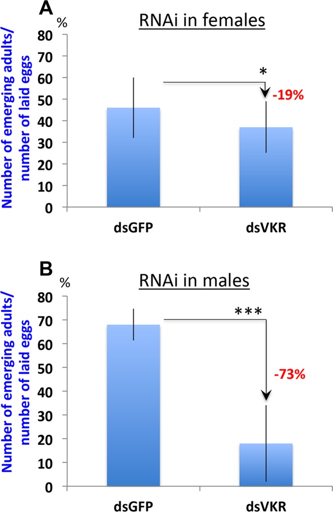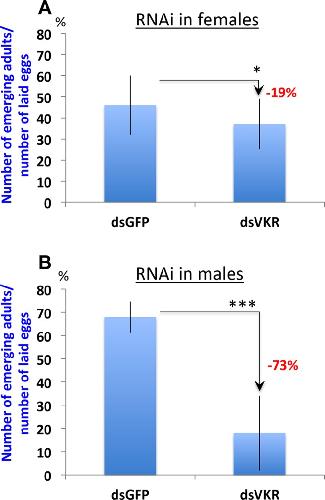 Figure 4. VKR is required in larval growth. VKR silencing either in female (A) or in male (B) mosquitoes affects the larval development of their progenies, considering the proportion of emerging adults reported to the number of eggs put in water. Stars (*) and (***) represent Chi2 test p-value < 0.05 and p-value < 0.001 respectively.