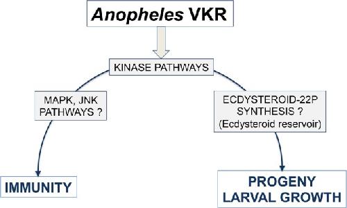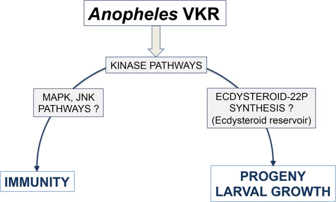 Figure 6. Proposed model for Anopheles VKR dual roles in both immunity and larval growth. As a tyrosine kinase receptor, activation of VKR in A. coluzzii would lead to activate kinase pathways, which are either involved in immunity (through potential activation of JNK and/or MAP pathways) or phosphorylate ecdysteroid (22P), which serve as a reservoir of ecdysteroids during the larval growth.