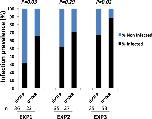 Figure 5. VKR is required for protective function against Plasmodium parasites. VKR restricts permissiveness of mosquitoes to P. berghei infection, measured as oocyst infection prevalence (proportion of infected mosquitoes). For each independent experiment, Chi-square p-values related to the proportion of infected mosquitoes (infection prevalence) between the two groups (dsGFP and dsVKR) are mentioned. Using the meta-analytical approach of Fisher to combine individual p-value related to infection prevalence from the three independent replicates, we found a statistically significant combined p-value (p = 0.0008).