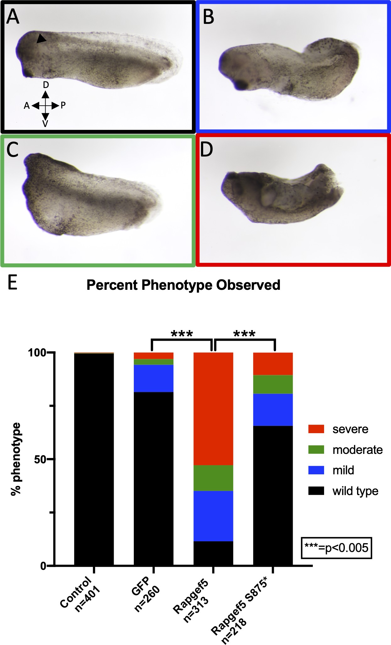 Overexpression of equine RAPGEF5 mRNA affects embryonic development in Xenopus tropicalis; however, the equine S875* RAPGEF5 variant has a dramatically diminished effect. (A) Normal development in uninjected control X. tropicalis embryos. All embryos are lateral views with anterior to the left and dorsal to the top. (B) Mildly affected development. Embryos display compromised elongation along anterior-posterior axis and a delayed formation of eyes and tail. (C) Moderately affected development. Most notably in this category embryos fail to form head structures (D) Severely affected development. Embryos display incomplete blastopore closure, incomplete neurulation, compromised elongation along anterior-posterior axis, and absence of distinguishable head structures. (E) Quantification of the phenotypes of the uninjected, equine RAPGEF5 mRNA injected, and equine S875* RAPGEF5 mRNA injected embryos classified as wildtype, mild, moderate, and severe at stage 28. Data is a compilation of three independent experiments. (*** p<0.0005). A = anterior, P = Posterior, D = Dorsal, Black triangle = filled arrowhead points to location of eye.
