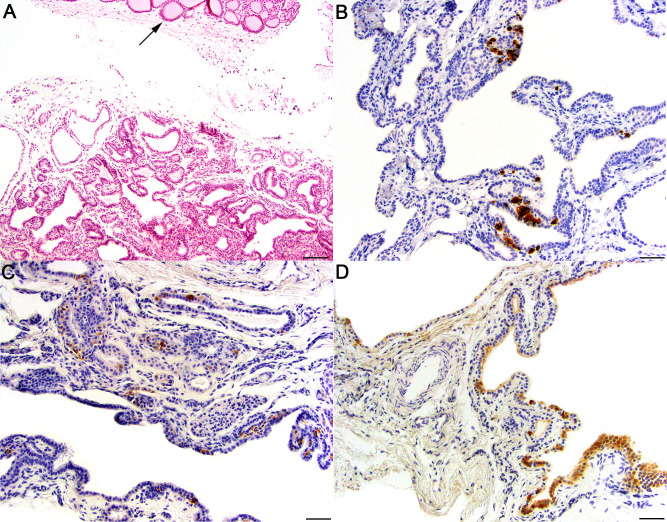 Fig 2. Necropsy of Case #3.Normal parathyroid was not observed histologically. However, a cystic structure was identified adjacent to the thyroid gland (A; arrow = thyroid gland, scale bar = 100 μm;), B-D This cystic structure had scattered immunoreactivity for (B) PTH, (C) calcitonin and (D) thyroglobulin (scale bar = 50 μm).