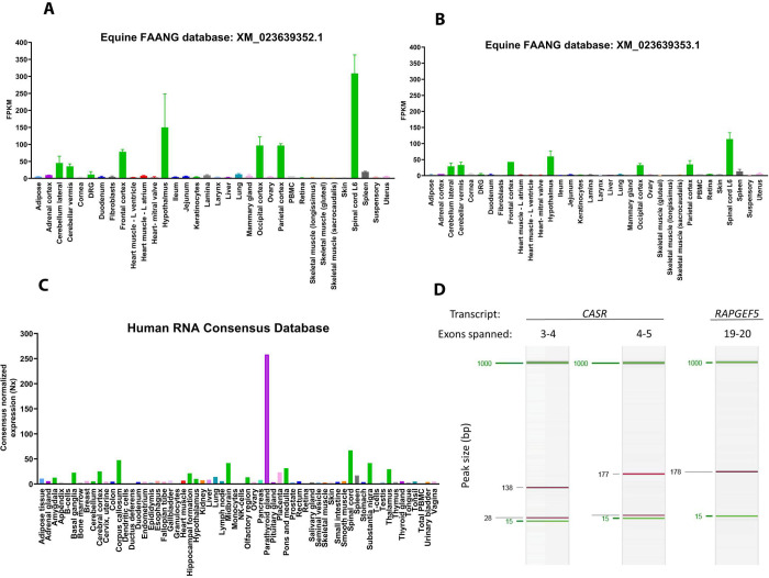 Fig 4. RAPGEF5 transcript expression across tissues in horse (A, B) and human (C).In 45 equine tissues with publicly available RNA-sequencing data from the FAANG initiative, the two NCBI annotated equine transcripts of RAPGEF5 (A) XM_023639352.1 and (B) XM_023639353.1 were most highly expressed in brain and spinal cord (green; median and 95% confidence interval graphed for n = 2 horses). Parathyroidtissue was not included in this biobank. (C) In humans, RAPGEF5 transcript expression was enriched in the nervous system (green) and endocrine tissues (purple). Parathyroid gland had the highest RNA expression of RAPGEF5. FPKM = fragments per kilobase of transcript per million mapped reads, Nx = consensus normalized expression. (D) RAPGEF5 is expressed in parathyroidtissue from a healthy control foal (primer sets spanning exons 19â20; expected product size 178 bp). Two primer sets, spanning exons 3â4 and 4â5 from CASR, were used as an internal control to confirm parathyroidtissue.