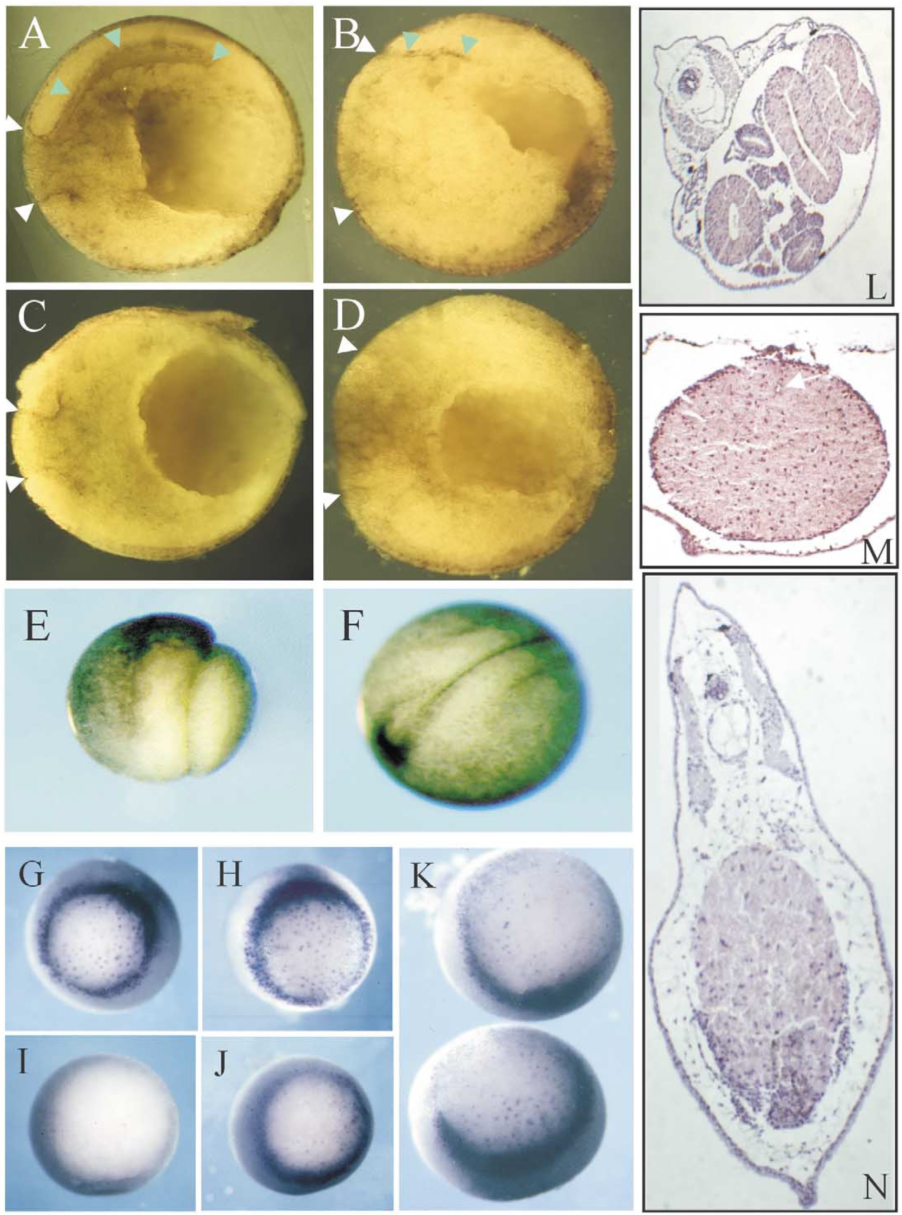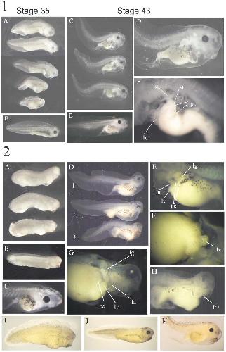 Fig. 4. Panel 1. Late effects of anti-Xsox17a2 morpholino (10 ng). (A) Typical phenotypes caused by the a2 morpholino at stage 32, with a control in (B). (C)