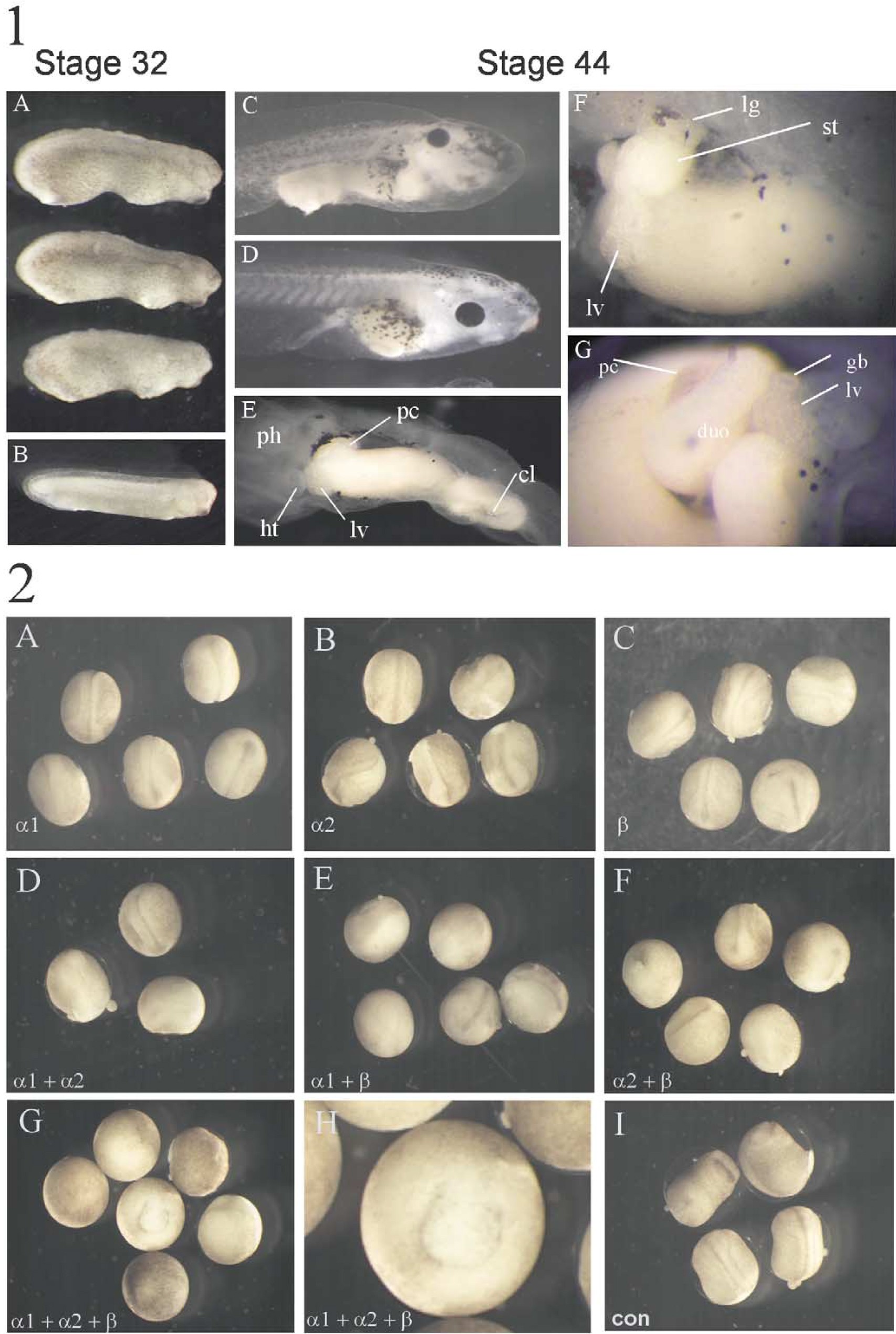 Fig. 3 except: gb, gall bladder; duo, duodenum; cl, cloaca. Panel 2. Effects of combinations of morpholinos at control stage 21. We injected 10 ng of each of the