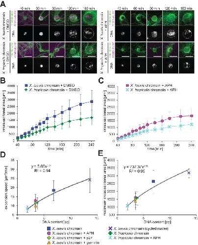 FIGURE 2:. Nuclear expansion dynamics using different sperm chromatins. (A) DNA, membrane, and incorporated TMR-dUTPs were visualized in the reconstructed nuclei from X. laevis or X. tropicalis sperm chromatin in the presence of DMSO (buffer control) or APH after the indicated incubation time. Merged images (top) of membrane (green) and TMR-dUTP (magenta) and DNA (bottom) are shown. Broken circles represent the position of the nuclear membrane. Bars, 50 µm. (B) Dynamics of the measured mean cross-sectional area in the nuclei from X. laevis (blue, n = 34) or X. tropicalis (green, n = 12) sperm chromatin. (C) Dynamics of the measured mean cross-sectional area in the nuclei from X. laevis (pink, n = 20) or X. tropicalis (light blue, n = 12) sperm chromatin in the presence of APH. Average values are connected by a line in each data set. Error bars, SD. (D) Calculated expansion speeds and (E) measured maximum values of the nuclear cross-sectional area during incubation were plotted against the DNA content within the nucleus. Averages of values in each DNA content are fitted to the power law regression. Error bars, SD. |