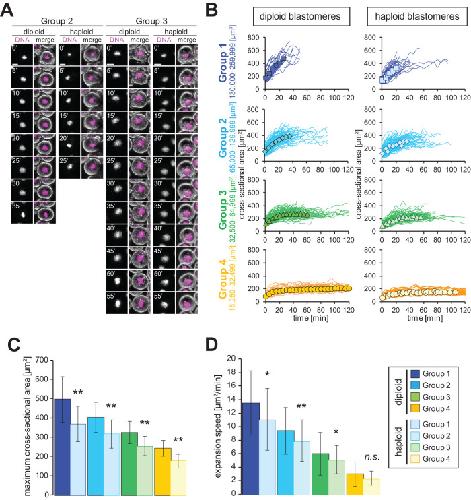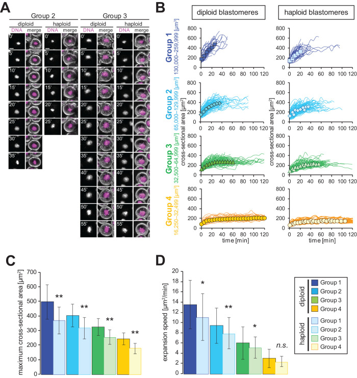 FIGURE 3:. DNA-content–dependent nuclear expansion in in vivo X. laevis embryos. (A) Snapshots of representative time-lapse images in translucent blastomeres from diploid or haploid X. laevis embryos in each group of the cell volume. DNA visualized by Hoechest 33342 (left) and merged images with phase contrast image (right) are shown. Images were taken at 5 min intervals. Bars, 20 µm. (B) Dynamics of individual nuclear cross-sectional area (line) and average cross-sectional area (symbols) in each group of the cell volume from diploid (filled symbols) or haploid (open symbols) blastomeres after initiation of interphase. The cell volume was estimated from the measured cross-sectional area by considering the cell as a sphere, and the analyzing groups were categorized as Group 1 (blue: n = 48 [diploid], 67 [haploid]; 130,000−259,999 µm3), Group 2 (light blue: n = 116 [diploid], 131 [haploid]; 65,000−129,999 µm3), Group 3 (green: n = 95 [diploid], 108 [haploid]; 32,500−64,999 µm3), and Group 4 (orange: n = 46 [diploid], 52 [haploid]; 16,250−32,499 µm3). The values are connected by a line for each individual observation. (C) Average measured maximum values (plateau values or values at the final measurement prior to NEBD) or (D) calculated expansion speed of the nuclear cross-sectional area in diploid or haploid blastomeres from each group. Error bars, SD. Asterisks, P value from Wilcoxon test compared with the diploid data in each group. * and **, statistically significant difference, P < 0.05 and P < 0.001, respectively. n.s., no significant difference. |