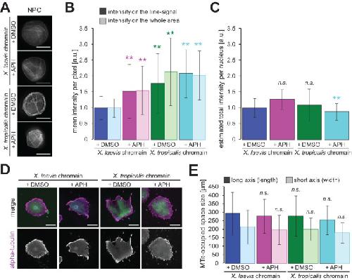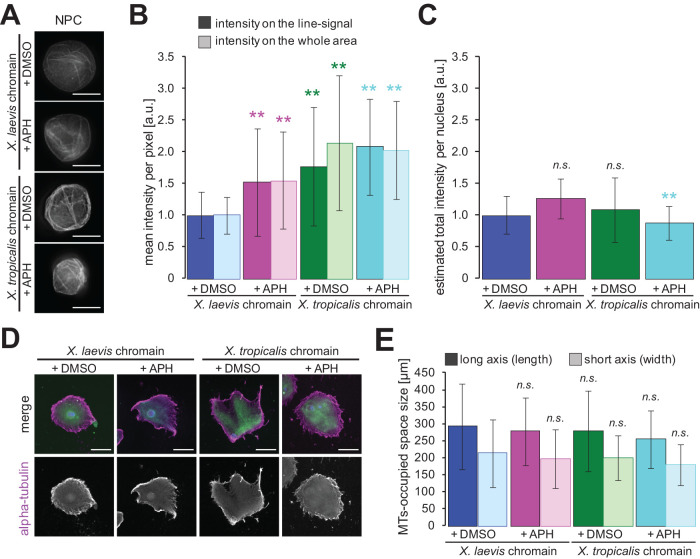 FIGURE 4:. Accumulation of membranes on the surface of nuclei with less DNA content. (A) NPCs on the reconstructed nuclei from X. laevis or X. tropicalis sperm chromatin in the presence of DMSO (buffer control) or APH were visualized after 120 min of incubation. Bars, 20 µm. (B) Average intensities of NPC-positive membrane signals per pixel on the continuous line pattern (filled bars) and throughout the whole nuclear section (dotted bars) of samples with different DNA contents. X. laevis chromatin with DMSO: n = 85 (line), n = 82 (area); X. laevis chromatin with APH: n = 92 (line), n = 90 (area); X. tropicalis chromatin with DMSO: n = 93 (line), n = 93 (area); X. tropicalis chromatin with APH: n = 80 (line), n = 67 (area). The measured intensity value from an individual image is normalized to the mean value of the control condition (X. laevis sperm chromatin without APH) in each extract preparation. (C) Estimated total intensities of NPC-positive membrane signals throughout the nuclear section among samples. The total intensity was estimated by multiplying the mean intensity by the measured nuclear cross-sectional area in each image, and the calculated value was normalized to the mean value of the control condition. (D) α-Tubulin (magenta), membranes (green), and DNA (blue) were visualized around the reconstructed nuclei with different DNA contents after 120 min of incubation. Merged images (top) and α-tubulin (bottom) are shown. Bars, 100 µm. (E) Average length (along the long axis) and width (along the short axis) of the MT-occupied space. Averaged values in each sample with different DNA contents were calculated. X. laevis chromatin with DMSO: n = 54 (length), n = 53 (width); X. laevis chromatin with APH: n = 132 (length), n = 134 (width); X. tropicalis chromatin with DMSO: n = 95 (length), n = 91 (width); X. tropicalis chromatin with APH: n = 122 (length), n = 121 (width). Error bars, SD. Asterisks, P value from Wilcoxon test compared with that in the control condition with X. laevis chromatin. **, statistically significant difference, P < 0.001. n.s., no significant difference. |