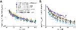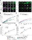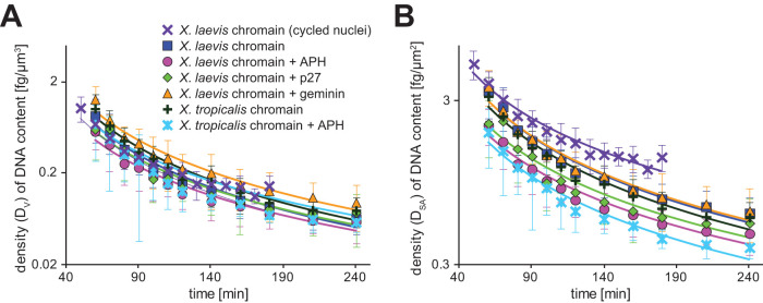 FIGURE 5:. Dynamics of the ratio of DNA content to nuclear size parameters during nuclear expansion. (A) Dynamics of density DV of DNA content per estimated nuclear volume in samples with different DNA content in X. laevis cytoplasmic extract. (B) Dynamics of density DSA of DNA content per estimated nuclear surface area in the samples with different DNA content in X. laevis cytoplasmic extract. Average values from each extract preparation are plotted. Each data set is fitted to the power regression line. Error bars, SD. |