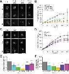 FIGURE 1:. Nuclear expansion dynamics after manipulation of DNA replication. (A) DNA, membrane, and incorporated TMR-dUTPs were visualized in the reconstructed nuclei in the presence of DNA replication inhibitors (APH, geminin, and p27) after the indicated incubation time. Merged images (top) of membrane (green) with TMR-dUTPs (magenta) and DNA (bottom) are shown. Broken circles represent the position of the nuclear membrane. Bars, 50 µm. (B) Dynamics of the intensities of the incorporated TMR-dUTPs in whole nuclei. The intensity was calculated by multiplying the measured mean TMR-dUTP intensity (/µm2) by the measured nuclear cross-sectional area. Each calculated value was divided by the mean value of the individual extract preparation after 120 min of incubation with X. laevis sperm chromatin. Control: n = 11; APH: n = 8; geminin: n = 3; p27: n = 4. (C) DNA (magenta) and membrane (green) were visualized in the nuclei from replicated chromatin in the second interphase of the cycling extract (cycled nuclei) and from sperm chromatin in the first interphase (control) after the indicated incubation time. Bars, 50 µm. (D) Dynamics of the measured mean cross-sectional area in the nuclei with X. laevis sperm chromatin in the presence of each DNA replication inhibitor (control: n = 34; APH: n = 20; geminin: n = 5; p27: n = 3) or with replicated chromatin in the cycling extract (cycled nuclei: n = 8). Average values are connected by a line in each data set. (E) Calculated expansion speeds and (F) measured maximum values of the nuclear cross-sectional area during incubation. Averages of values from each extract preparation are plotted. Error bars, SD. Asterisks, P value from Wilcoxon test compared with samples in the control. * and **, statistically significant difference, P < 0.05 and P < 0.001, respectively. |