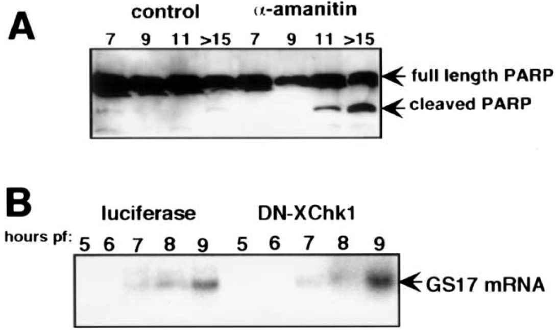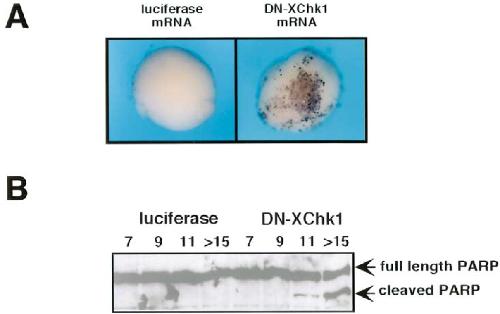 Fig. 3. Inhibition of endogenous XChk1 results in apoptosis at the MBT. Embryos were injected with luciferase or DN-XChk1 mRNA at the one-cell stage. (A) Albino embryos were fixed and processed for TUNEL assays when morphology of embryos expressing DN-XChk1 appeared abnormal (approximately 12 hpf). A positive TUNEL is indicated by purple staining of nuclei. In a typical experiment 0-20% of luciferase-expressing embryos and 80-100% DN-XChk1-expressing embryos scored TUNEL-positive. (B) Embryos injected with luciferase or DN-XChk1 mRNA were assayed for caspase activity by the cleavage of the exogenous substrate, PARP. Times (h pf) are indicated.