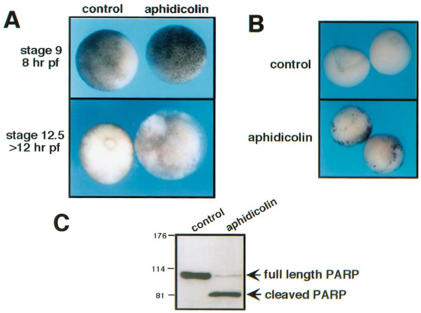 Fig. 4. A block to DNA replication at the MBT induces apoptosis after the MBT in Xenopus embryos. (A) Embryos were incubated in 100 mg/ml aphidicolin during the MBT (6 h pf), then were photographed when controls reached stage 9 (8 h pf) and stage 12.5 (.12 h pf). In aphidicolin-treated embryos, cell cycle arrest was observed at 8 h and embryos were dying by 12 h. (B) Albino embryos were treated with aphidicolin at the MBT (5.5 h pf) and fixed and processed along with sibling controls for TUNEL assays when morphology appeared abnormal (.12 h pf). (C) Control embryos and embryos treated with aphidicolin at the MBT (6 h pf) were snap-frozen and assayed for caspase activity when controls gastrulated (approximately 12 h pf). The migration of molecular weight standards (in kDa) is indicated on the left.