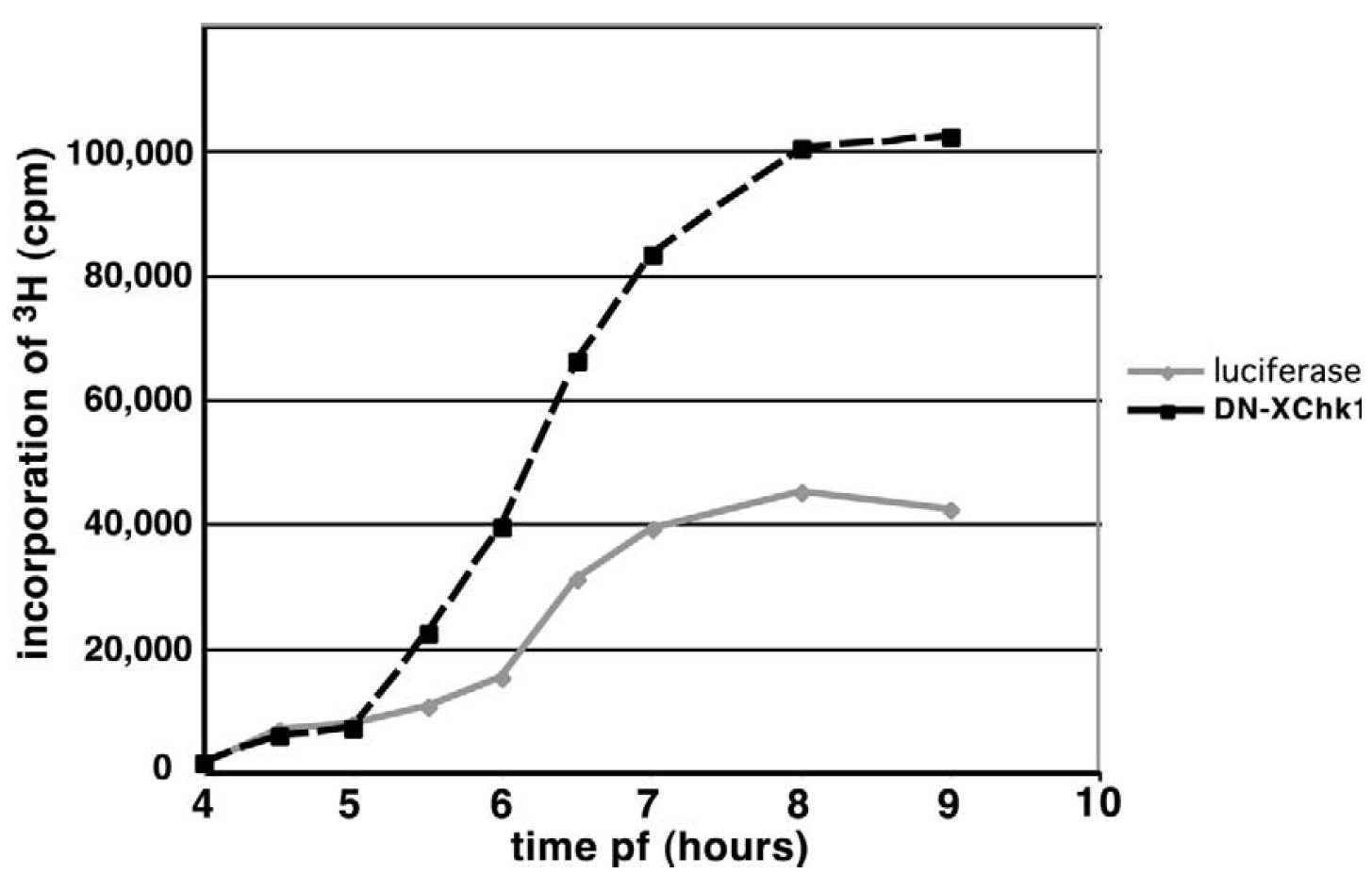 Fig. 5. Expression of DN-XChk1 results in elevated incorporation of [3H]thymidine after the MBT. Embryos were injected with luciferase or DN-XChk1