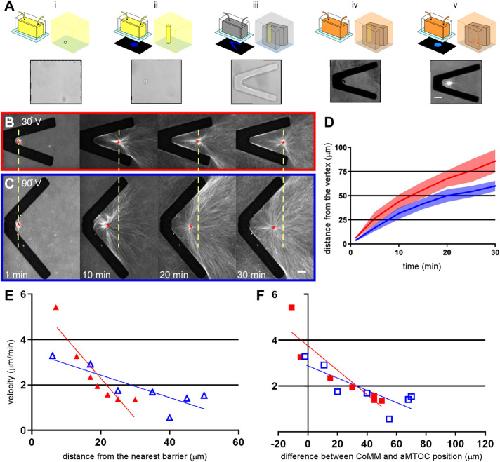 FIGURE 3:. Aster movement away from V-shaped barriers implies a pushing-based mechanism for translocation. Each of the paired sets of cartoon depictions in the top row of A shows a microfluidic device (left) and a zoomed-in view of the channel interior (right) for the different steps required for aMTOC capture and V-shaped structure formation. Corresponding bright-field and fluorescent images of each sequential step, moving left to right, are shown in the bottom row. (i) A photolabile prepolymer hydrogel solution (PEGdiPDA) containing aMTOCs was flowed into the channel of a microfluidic device. (ii) The hydrogel solution was exposed to UV light (λ = 405 nm) patterned using a digital micromirror array placed in a conjugate plane to the specimen in the light path of the microscope. For these experiments, a small circle in the electronic mask was aligned with an aMTOC in the PEGdiPDA solution. Upon exposure, this produced a cylindrical column of photolabile hydrogel surrounding an aMTOC at its base, temporarily fixing it in place and preventing the aMTOC from being washed away in subsequent steps. This anchoring step was repeated for multiple aMTOCs in the prepolymer solution. (iii) A nondegradable prepolymer hydrogel solution (PEGDA) was flowed into and exposed to UV light (λ = 405 nm) in the shape of a V aligned such that the aMTOC being targeted was positioned close to the vertex of the hydrogel structure. (iv) After the generation of all structures, the unpolymerized solution within the device was washed out with buffer and ultimately replaced with interphase X. laevis egg extract. (v) The aMTOC was released by degrading the PEG-diPDA cylinder with exposure to higher-energy UV light (λ = 365 nm). Extracts were supplemented with mCherry-TMBD, and aMTOC aster movement was recorded using time-lapse spinning-disk confocal microscopy as in Figure 1. An example of aster movement from the vertex of a 30°V is shown in B and from a 90°V in C. The yellow dashed line in each image extends from the center of the aMTOC position (red asterisk) in B and is included to facilitate comparison of aMTOC velocity away from the vertex in C. aMTOC movement away from the vertex of the 30°V (average position, red line) and 90°V (average position, blue line) structures was plotted as a function of time to make the graphs shown in D. Shaded outlines represent 95% confidence intervals; n ⥠10 for each V type. Using the slopes from these plots, the aMTOC instantaneous velocity was plotted vs. the shortest distance to the nearest barrier surface (E) and the distance between the CoMM (see Materials and Methods) and the aMTOC (F) for both 30°V (filled red triangles and squares, respectively) and 90°V (open blue triangles and squares, respectively) structures. Here a positive velocity indicates that the aMTOC was moving away from the vertex. For all images, scale bars = 20 µm. |