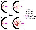 FIGURE 5:. Cartoon summary for how MT-based pushing forces might facilitate aster movement in our system. The cartoon in A depicts how asters might behave assuming an unbranched, radial elongation model of aster growth. Initially, short unbundled MTs extending from the aMTOC and reaching the proximal barrier surface might be able to generate sufficient force to produce aster movement. However, later in time, once MTs approach their critical length, they would buckle under compressive loads, resulting in reduced force generation and a failure to center (dashed yellow line). The cartoon in B shows an architecturally more complicated aster with MT branching and bundling to effectively brace MTs and allow for more growing ends to impinge on the proximal barrier surface. In this model, MTs would be sufficiently buttressed by interactions with other MTs, resulting in a larger pushing force and, ultimately, a longer distance through which asters could traverse. |
