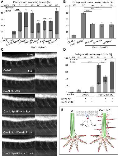Figure 7. Y14 phosphorylation of Cav1L is necessary for Rho GTPases dependent axonal outgrowth and pathfinding of motor neurons. (A,B) Co-injection of 10 pg ca Cdc42, dn RhoA or dn Rac1 with 10 ng Cav1L Spl-MO in neural tissue significantly improved swimming defect (A) and motor neuron outgrowth (B) caused by Cav1L loss-of-function. Significances of the rescue experiments were calculated in comparison to the Cav1L Spl-MO injected embryos. (C) Motor neuron outgrowth was analyzed by Ncam immunostaining, injected constructs are indicated. (D) Overexpression of 200 pg cav1L Y14A RNA in Cav1L-morphant (10 ng) embryos did not rescue swimming defects, while 200 pg of wild-type cav1L significantly improved the morphant phenotype, when injected into one blastomere of the two-cell stage. All graphs (BâD) present data from at least three experiments as the meanâ±âs.e.m. ***p-valueââ¤â0.001 (one-way ANOVA comparing the total number of swimming defects). (E) Model of Cav1L function in motor neuron outgrowth. Tyrosine phosphorylated Cav1L (blue, with red Y14 phosphorylation) affects Rho GTPases. The morphology of a wild-type (WT) and Cav1L-morphant motor neuron is shown; microtubules (green) and actin bundles (red) are shown. |