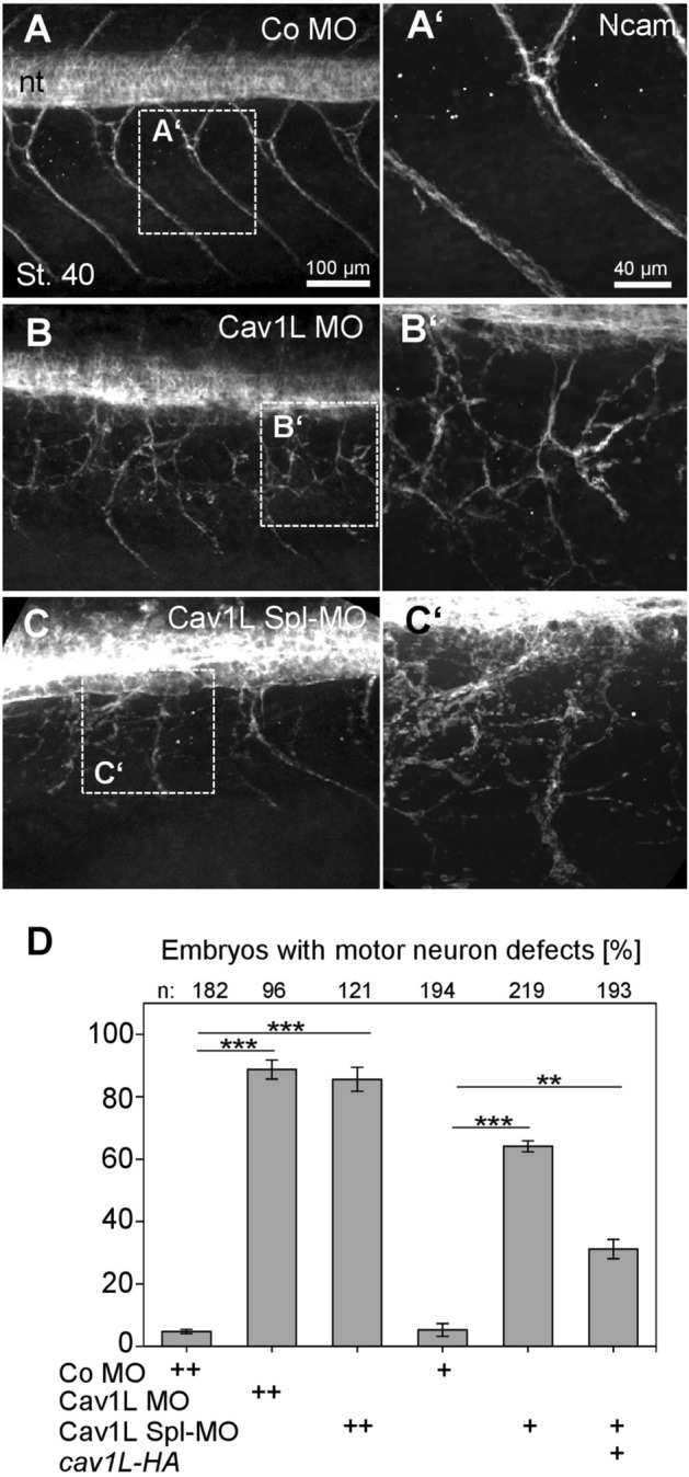 Figure 5. Loss of Cav1L affects motor neuron morphology. (AâD) Embryos, injected unilaterally with 20 ng MO at the two-cell stage, were immunostained using the neuronal surface marker Ncam. (A) Motor neurons display a characteristic chevron-shaped pattern in controls; ntâ=âneural tube. (B,C) Motor neuron outgrowth and pathfinding is severely impaired in Cav1L morphants. (Aâ,Bâ,Câ) Higher magnification of the dashed areas shown in (AâC). (D) Percentages of motor neuron outgrowth defects of Morpholino-injected embryos (20 ng,â+â+) and embryos injected unilaterally with 10 ng MO (+) in combination with 200 pg cav1L-HA. Co-expression of cav1L-HA partially rescues motor neuron defects. Graph in (D) present data as the meanâ±âs.e.m. from at least three experiments. Number of analyzed embryos is indicated for each column. **p-valueââ¤â0.01 ***p-valueââ¤â0.001 (one-way ANOVA). |
