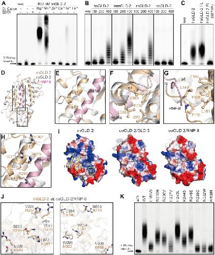 Figure 3. rnGLD-2 is a potent PAP. (A) The PAP activity of rnGLD-2 in the presence of various divalent cations. A total of 400 nM rnGLD-2 was incubated with 500 nM 5â² biotinylated A15 RNA oligo and 500 μM ATP. For each sample, 2 mM indicated divalent ion or EDTA was supplied to the reaction. w/o, without protein. (B) Protein concentration-dependent PAP activity of hsGLD-2, mmGLD-2, rnGLD-2 and ceGLD-2. (C) Comparison between truncated and full-length hsGLD-2 in PAP activity. (D) Overall structural comparison between rnGLD-2 and ceGLD-2/RNP-8 complex from the backside of the catalytic domain, where the interaction site of ceGLD-2 and RNP-8 can be seen. Frames indicate the areas shown in panels (EâH). (EâH) Detailed structure differences between rnGLD-2 and ceGLD-2 explaining the discrepancy of their PAP activity. Color as in D. (E) The unique 310 helix (η1) of rnGLD-2 and its relative position to RNP-8. (F) Interaction between η1 and α4 buries the local hydrophobic cluster of rnGLD-2. (G) The N-terminal tip of rnGLD-2 shelters the hydrophobic residues on α1 and α5. (H) The histidine cluster on η1 and non-conserved Arg295 of rnGLD-2. (I) Electrostatic surface potential comparison at the backside of catalytic center for rnGLD-2 (left) and ceGLD-2 complexed with GLD-3 (middle) or RNP-8 (right). Locations of the N-terminal tip (N) and 310 helix (η1) of rnGLD-2 are outlined by yellow dashes, and the histidine cluster and Arg295 are indicated. GLD-3 and RNP-8 are shown in cartoon representation with 50% transparency. (J) Non-conserved surface residues between rnGLD-2 and ceGLD-2 that may affect substrate binding. (K) PAP activity of rnGLD-2 with mutations regarding the residue difference from ceGLD-2 as shown in (J).