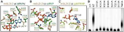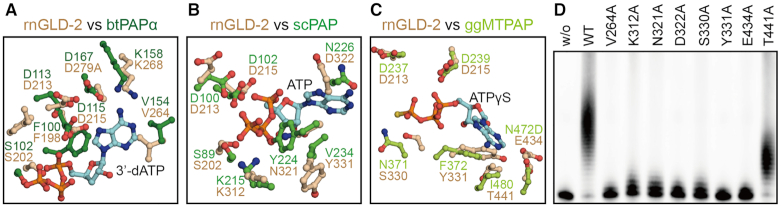 Figure 4. Important residues for ATP coordination of rnGLD-2. (A−C) Comparison between rnGLD-2 and other PAPs at adenosine nucleotide binding site. Residues of Bos taurus (bt)PAPα (PDB code: 1f5a, A), Saccharomyces cerevisiae (sc)PAP (PDB code: 2q66, B) and Gallus gallus mitochondria (ggMT)PAP (PDB code: 5a30, C) involved in binding 3′-dATP, ATP and ATPγS are individually superimposed with corresponding residues of rnGLD-2. (D) PAP activity of rnGLD-2 with mutations regarding the residues potentially involved in ATP coordination as shown in A−C.