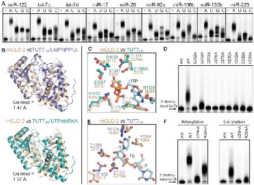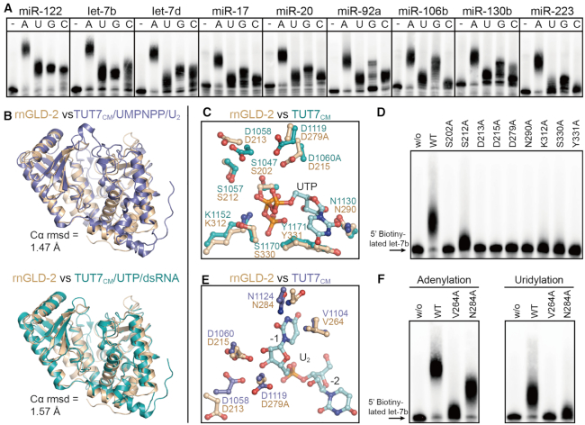 Figure 6. Similarity between rnGLD-2 and TUT7CM. (A) NTase activity of rnGLD-2 on different miRNA substrates. A total of 400 nM rnGLD-2, 500 nM various 5′-biotinylated miRNA and 500 μM ATP/UTP/GTP/CTP were used. (B) Overall structure comparison between rnGLD-2 and TUT7CM in complex with UMPNPP/U2 (upper, PDB code: 5w0n) and with UTP/dsRNA (lower, PDB code: 5w0o). (C) Comparison between rnGLD-2 and TUT7CM at UTP binding site. Residues of TUT7CM (PDB code: 5w0o) involved in binding UTP is superimposed with corresponding residues of rnGLD-2. (D) Uridylation activity of rnGLD-2 with mutations regarding the residues potentially involved in UTP coordination. (E) Comparison between rnGLD-2 and TUT7CM at substrate binding site. Residues of TUT7CM (PDB code: 5w0n) involved in binding the U2 substrate is superimposed with corresponding residues of rnGLD-2. (F) Adenylation and uridylation activity of rnGLD-2 with mutations regarding the residues potentially involved in substrate binding.