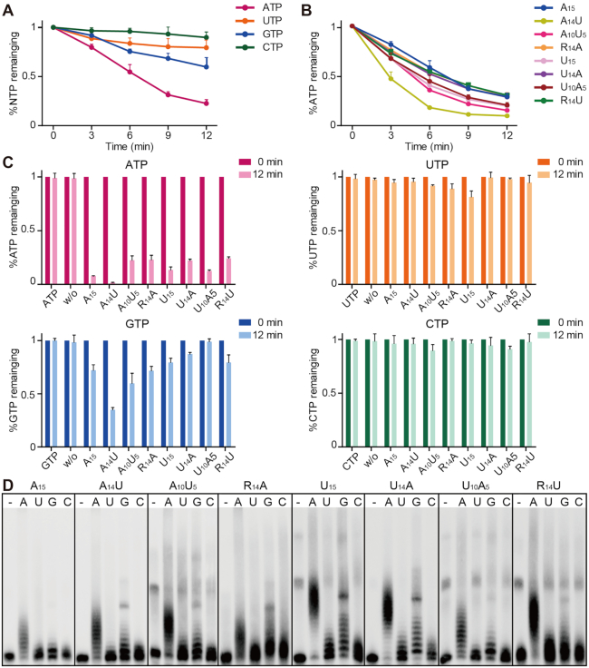 Figure 5. Substrate preference of rnGLD-2. (A) Time-course NTP consumption of rnGLD-2 with A15. Error bars indicate s.d. (n = 3). (B) Time-course ATP consumption of rnGLD-2 with various 15-mer RNA oligos. (C) NTP consumption of rnGLD-2 with various 15-mer RNA oligos. (D) Nucleotidyltransferase assays showing the preference of rnGLD-2 on various substrates and different nucleotides. 400 nM rnGLD-2, 500 nM 5Ⲡbiotinylated 15-mer RNA substrates with various sequences, and 500 μM ATP/UTP/GTP/CTP were used.