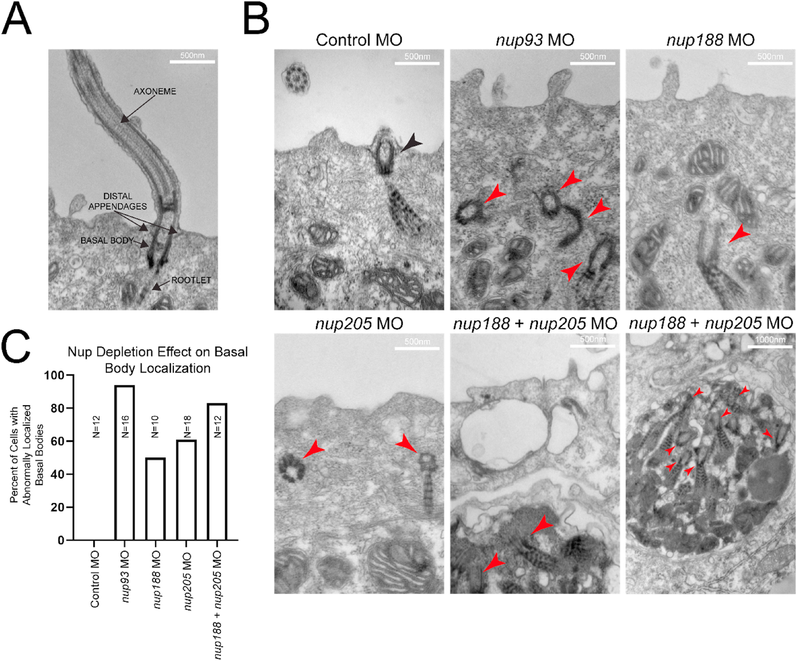 Fig. 3. Knockdown of Inner-Ring NUPs Disrupts Cilia. (A) Examples of cilia components. (B) Representative images of cilia within MCCs of control and inner-ring NUP knockdown morphant embryoepidermis. Black arrowheads indicate properly positioned ciliary components, red arrowheads indicate mispositioned ciliary components beneath the cell surface. Note the apparent inclusion body with multiple ciliary components in the cases of nup188 + nup205 knockdown. (C) Percentages of visualized cells with abnormally positioned basal bodies at cell surface for each condition (basal bodies within 100â¯nm of surface were considered to be normally localized). Ns indicate number of cells assessed from a single embryo per condition. (For interpretation of the references to color in this figure legend, the reader is referred to the Web version of this article.)