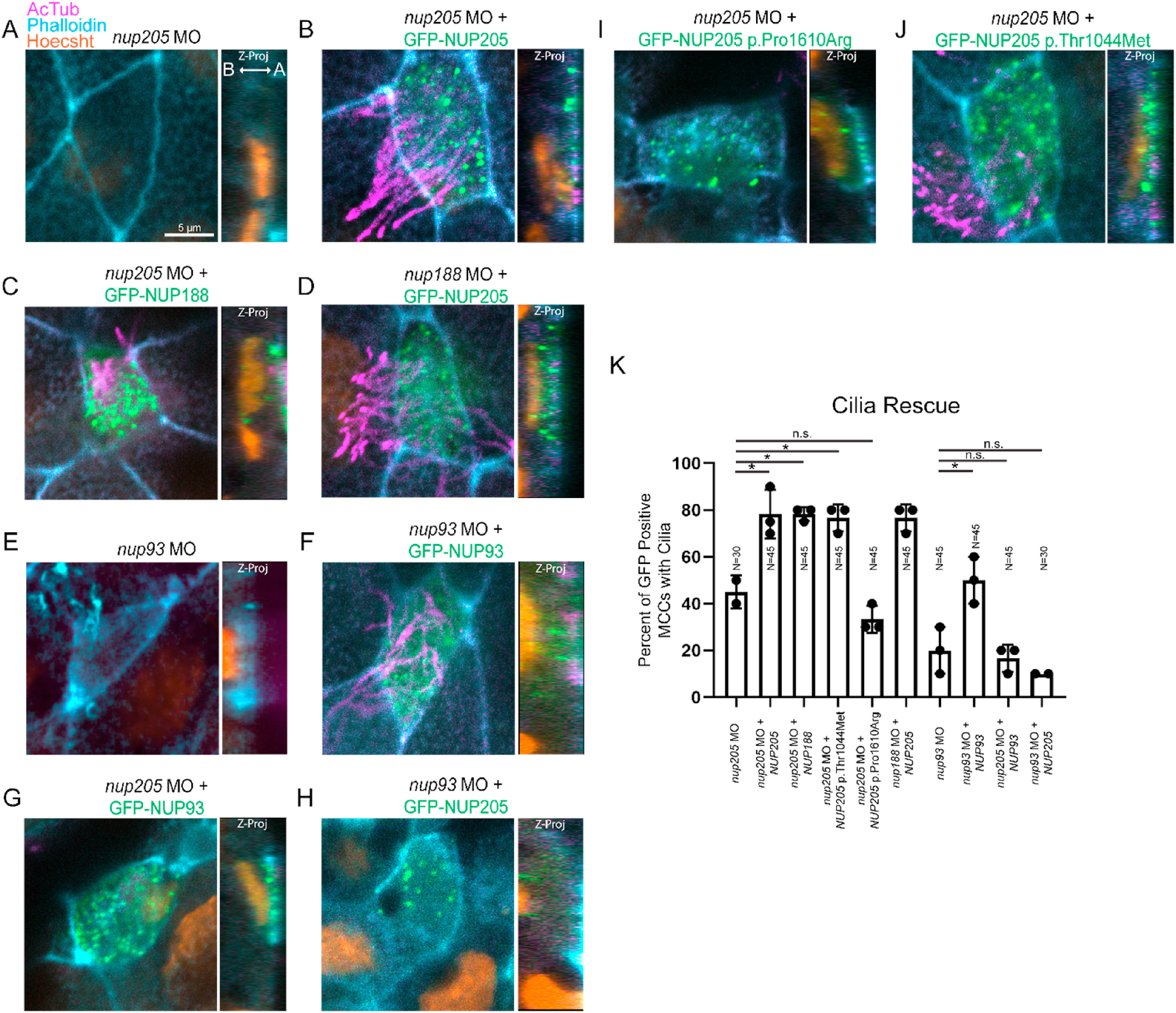 Fig. 4. Inner-Ring Nucleoporin Roles Overlap. (AâD) Knockdown of nup205 loss of MCCcilia can be rescued with GFP-NUP188 or GFP-NUP205 respectively. Similarly, knockdown of nup188 loss of MCCcilia can be rescued with GFP-NUP205 (EâH) Knockdown of nup93 and loss of MCCcilia can be rescued with GFP-NUP93, but knockdown of nup205 and loss of MCCcilia cannot be rescued not be rescued with GFP-NUP93 nor can knockdown of nup93 and loss of MCCcilia be rescued with GFP-NUP205 (IâJ) Knockdown of nup205 and loss of MCCcilia can be rescued with GFP-NUP205 (3131Câ¯>â¯T) but not GFP-NUP205 (4829Câ¯>â¯G). (K) Quantitation of rescue efficiencies amongst morphant and reintroduced NUPs/NUP variants with pairwise comparisons assessed via two-tailed T-test with * designating p < 0.05. Ns indicate number of MCCs assessed with 3 MCCs assessed per embryo across 3 replicates per condition. A: Apical B: Basal.