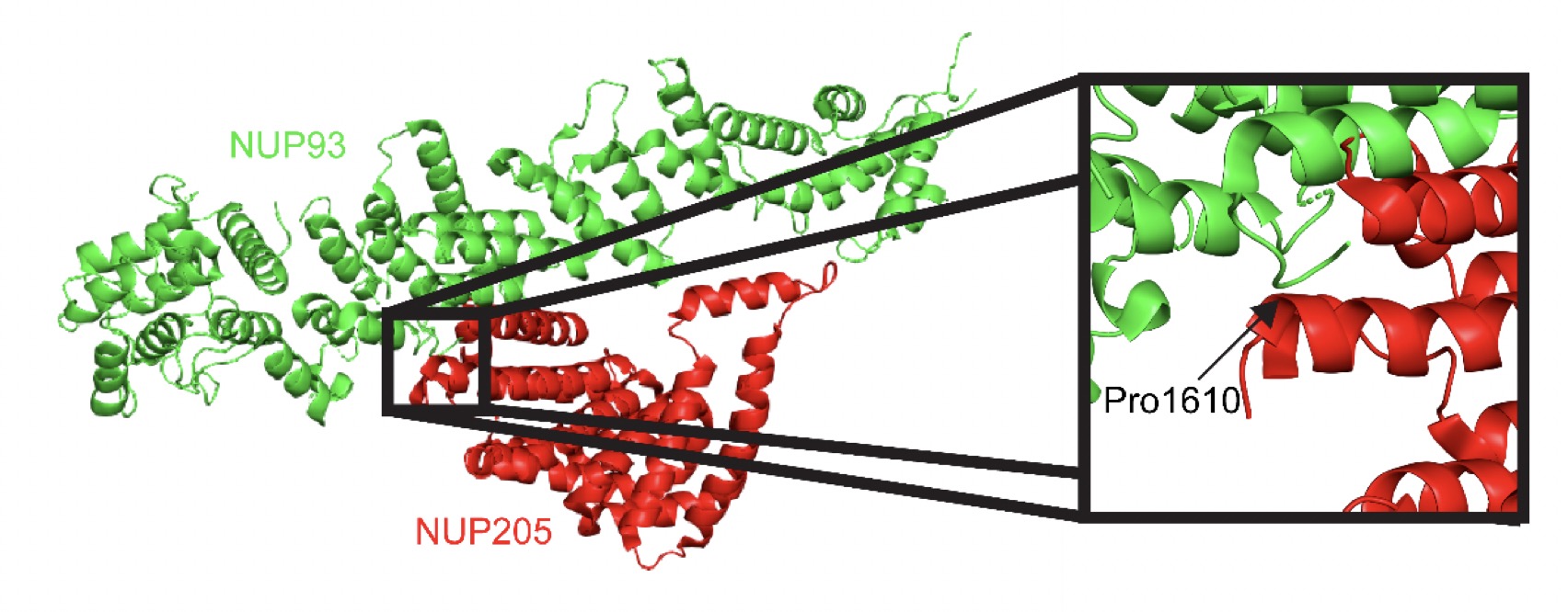 Fig. S5. NUP205 Variant May Weaken Protein-Protein Interactions. The published structure of the NPC was used to determine the location of amino acid residue changes resulting from variants in an individual with heterotaxy. Left: The 3D structure of NUP93 and NUP205 (pdb: 5IJO): NUP93 (green) and NUP205 (red). Inset on right: The 3D structure of an interface region between NUP93 and NUP205.