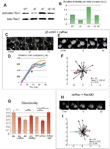 Figure 3. Truncated cadherins modulate Rac1 activity responsible for single cell CIL, collective CIL, and single cell persistence. (A) Rac1 activity is modulated from WT levels by ÎE-cdh3 (ÎE), ÎC-cdh3 (ÎC), and ÎE-cdh3â+âÎC-cdh3 (ÎEâ+âÎC). (B) Rac1 activity of (A) normalized to WT levels. Rac1 activity in ÎE-cdh3 and ÎC-cdh3 expressing cells was 0.4- and 1.8-fold of WT levels. ÎEâ+âÎC activity was not significantly different from WT levels. Full-length blots are presented in Figure S7A. (C) Mesendoderm closure in embryos co-injected with ÎE-cdh3â+âconstitutively active form of Rac1 (caRac). (D) Time-courses of mesendoderm closure from five embryos. (E) Single cell collisions of ÎE-cdh3â+âcaRac expressing cells. (F) Summary of collisions of ÎE-cdh3â+âcaRac expressing cells (Nâ=â42, meanâ=âââ167.8°, pâ=â0.43). (G) Directionality of single cell migrations of ÎE-cdh3â+âcaRac (ÎEâ+âcaRac), ÎC-cdh3â+âdominant negative form of Rac1 (dnRac) (ÎCâ+âdnRac), caRac and dnRacâ+âRac1 morpholino oligomers (RacMO) (dnRacâ+âRacMO) compared with ÎE-cdh3 (ÎE), ÎC-cdh3 (ÎC) and WT, respectively (light red for comparison from Fig. 2E). (H) Single cell collisions of dnRacâ+âRacMO co-injected cells. (I) Summary of collisions of dnRacâ+âRacMO co-injected cells (Nâ=â44, meanâ=â9.0°, pâ=â0.08). All scale bars are 20 µm. |