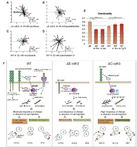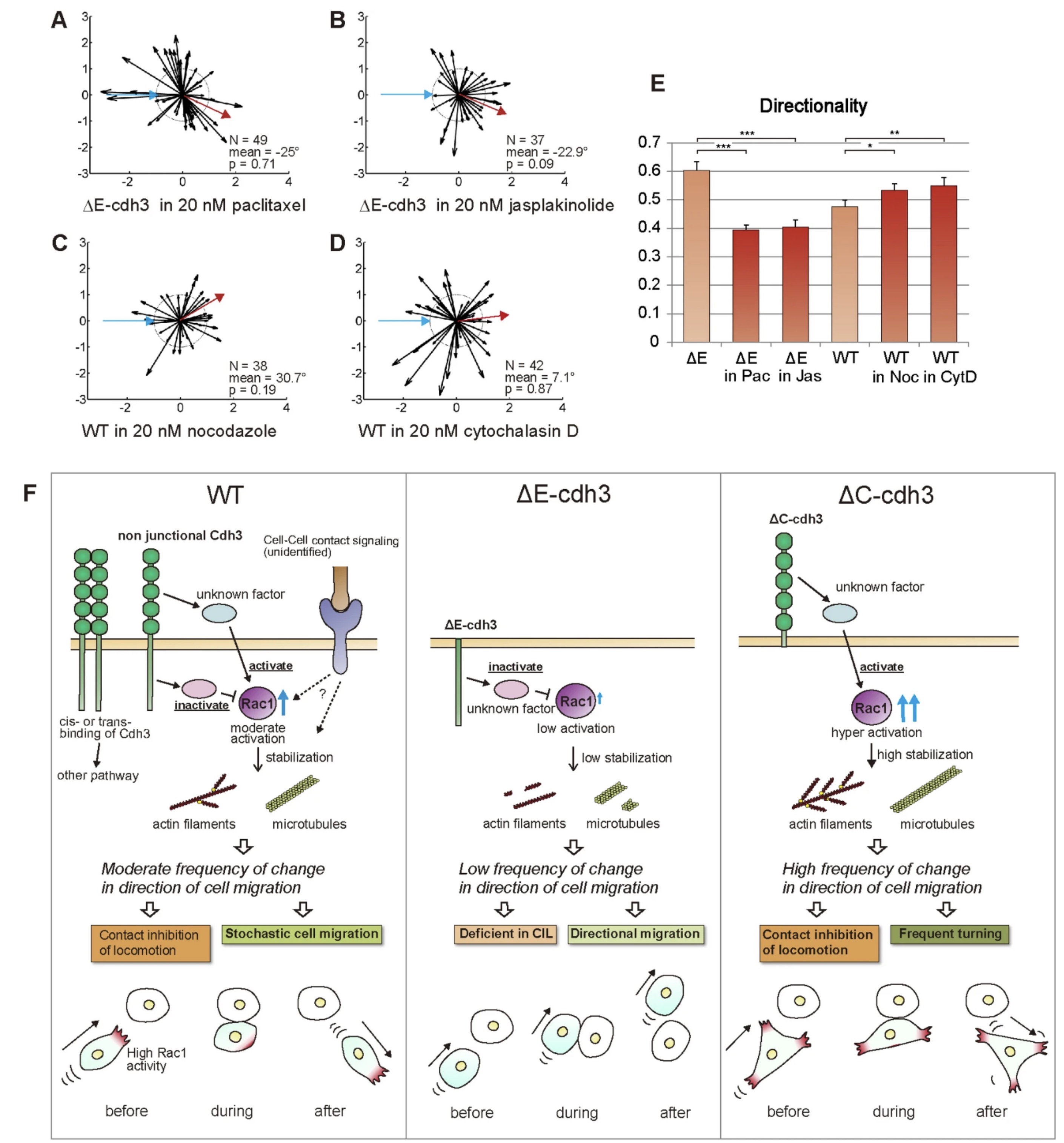 Figure 5. Effects of non-junctional cadherin3 on single-cell CIL and persistence of single-cell migration mitigated by changes in cytoskeletal stability. (A) Summary of collisions of ÎE-cdh3 expressing cells in 20 nM paclitaxel (Nâ=â49, meanâ=â-25, pâ=â0.71). (B) Summary of collisions of ÎE-cdh3 expressing cells in 20 nM jasplakinolide (Nâ=â37, meanâ=âââ22.9°, pâ=â0.09). (C) Summary of collisions of WT cells in 20 nM nocodazole (Nâ=â38, meanâ=â30.7°, pâ=â0.19). (D) Summary of collisions of WT cells in 20 nM cytochalasin D (Nâ=â42, meanâ=â7.1°, pâ=â0.87). (E) The quantified directionality of single-cell migration of ÎE-cdh3 cell in 20 nM Paclitaxel (ÎE in Pac), ÎE-cdh3 cell in 20 nM Jasplakinolide (ÎE in Jas), WT cell in 20 nM Nocodazole (WT in Noc), and WT cell in 20 nM Cytochalasin D (WT in CytD) compared with ÎE-cdh3, and WT, respectively (light red for comparison from Fig. 2E). (F) Model of the hypothetical mechanism regulating CIL and directionality of single-cell migration in cells expressing non-junctional Cdh3 or truncated cdh3s through localized Rac1 activity and cytoskeleton stability. Rac1 is regulated independently by extracellular and cytoplasmic domains of non-junctional cadherin oppositely through unknown factors. Signals induced by cellâcell contact may also regulate CIL with potential signaling through either cis- and trans-bonds between Cdh3. In WT cells, Rac1 activity is held at moderate levels by the extracellular and cytoplasmic domains of non-junctional cdh3. Moderate Rac1 activity leads to moderate levels and gradient of cytoskeletal stability. As a stable cytoskeleton supports persistent migration, the moderate stability of the cytoskeleton in WT cells results in the moderate frequency of change in the direction of cell migration and enables CIL and moderate directionality of single-cell migration. In ÎE-cdh3 expressing cell, expression of the cytoplasmic domain of Cdh3 suppresses Rac1 activity and destabilizing the cytoskeleton; resulting in a low frequency of change in the direction of cell migration, defective-CIL, and lowered persistence. Meanwhile, ÎC-cdh3 hyper activates Rac1 and leads to the stable cytoskeleton and high frequency of change in the direction of cell migration, resulting in frequent turning and cells capable of CIL. The illustration was drawn using Adobe Illustrator Version 24.1.1 (https://www.adobe.com/products/illustrator.html). |