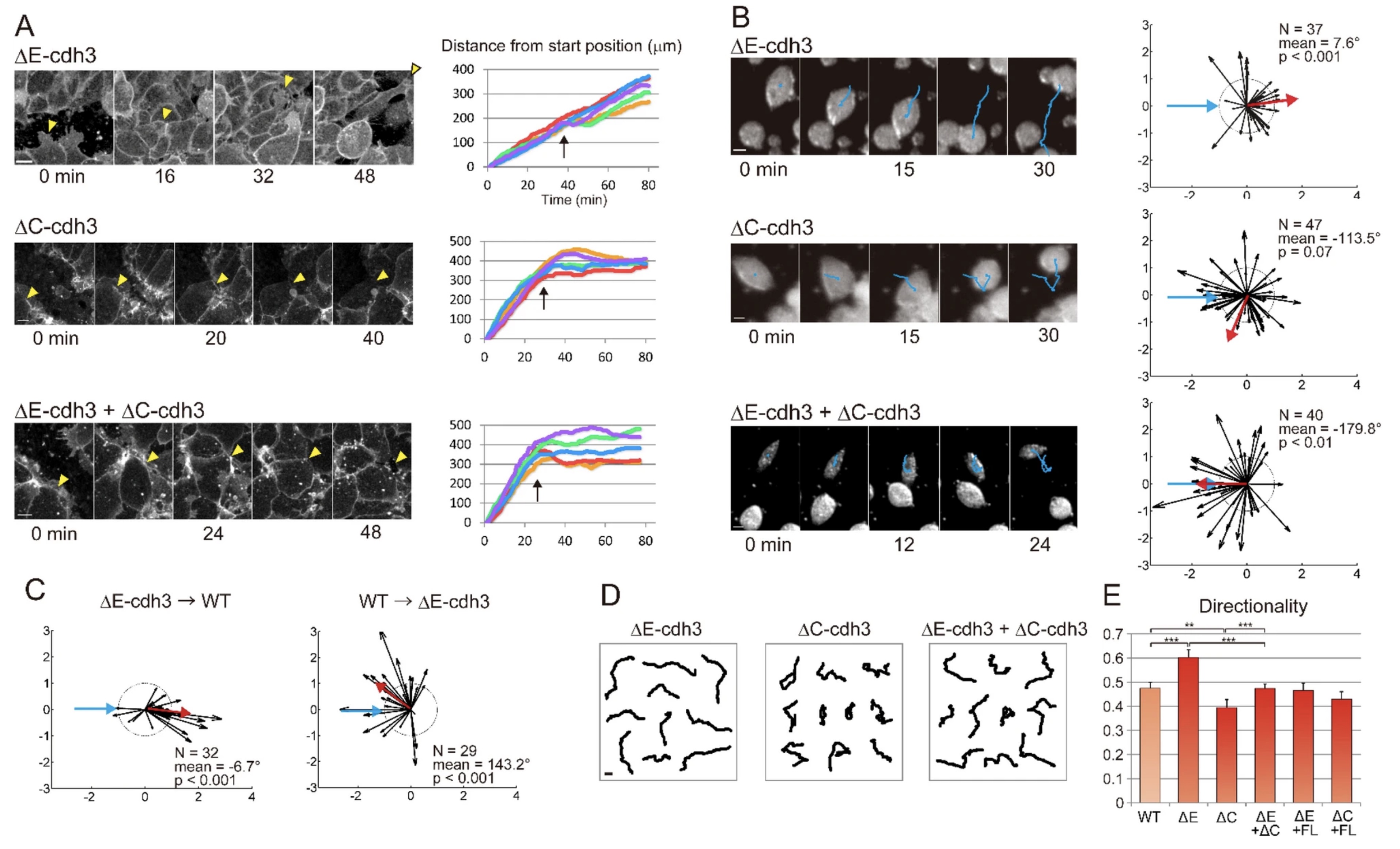 Figure 2. Truncation mutants of Cdh3 independently regulate collective CIL, single cell CIL, and single cell persistence. (A) Frames from a representative confocal time-lapse sequence (left; leading edge, yellow arrowheads) of membrane-targeted GFP expressing mesendoderm mantle closure in embryos expressing extracellular truncated Cdh3 (ÎE-cdh3), cytoplasmic domain truncated Cdh3 (ÎC-cdh3), and ÎE-cdh3â+âÎC-cdh3. Positions of leading edge mesendoderm movements during closure (including sequences shown at left, nâ=â5; arrows indicate time of collision). (B) Collisions of ÎE-cdh3, ÎC-cdh3, and ÎE-cdh3â+âÎC-cdh3 expressing single cells (left; trajectories shown in blue). Angle followed by cells after collision (right; mean angle, red; ÎE-cdh3, Nâ=â37, meanâ=â7.6°, pâ<â0.001; ÎC-cdh3, Nâ=â40, meanâ=âââ179.8°, pâ<â0.01; ÎE-cdh3â+âÎC-cdh3, Nâ=â47, meanâ=âââ113.5°, pâ=â0.07). (C) Collisions between ÎE-cdh3 expressing cells and WT cells. Left: Summary of collisions of ÎE-cdh3 expressing cells into WT cells (Nâ=â32, meanâ=âââ6.7, pâ<â0.001). Right: Summary of single cell collisions of WT cells into ÎE-cdh3 expressing cells (Nâ=â29, meanâ=â143.2, pâ<â0.001). (D) Single cell trajectories over 1 h without collision of ÎE-cdh3, ÎC-cdh3 and ÎE-cdh3â+âÎC-cdh3 expressing cells. (E) Directionality of single cell migration of ÎE-cdh3 (ÎE), ÎC-cdh3 (ÎC), ÎE-cdh3â+âÎC-cdh3 (ÎEâ+âÎC), ÎE-cdh3â+âfull length of Cdh3 (FL-cdh3) (ÎEâ+âFL), ÎC-cdh3â+âFL-cdh3 (ÎCâ+âFL). All scale bars are 20 µm. |