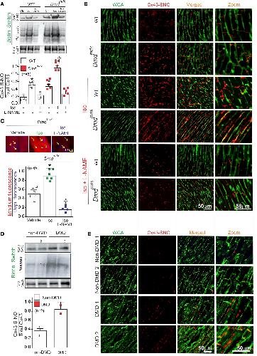 Figure 3 Iso increases S-nitrosylated levels of Cx43 at the lateral side of Dmdmdx cardiomyocytes. (A) Top and middle gels were loaded with S-nitrosylated proteins pulled down from heart samples using the biotin switch assay. Top gel was, then, blotted against Cx43, and the middle gel is the corresponding Ponceau staining. Lower blot was loaded using total cardiac proteins and blotted against Cx43. The bottom graph is the quantification for 5 independent blots using the ratio for S-nitrosylated Cx43/Ponceau. The number in parentheses indicates the n value. Comparisons between groups were made using 2-way ANOVA plus Tukey’s post hoc test. *P < 0.05 vs. WT control, and †P < 0.05 vs. WT Iso. (B) Analysis performed by PLA of the interaction between Cx43 and S-nitrosylation. Plasma membrane stained with wheat germ agglutinin (WGA) and S-nitrosylated Cx43 (Cx43-SNO) are shown in green and red, respectively. Representative images of n = 5 per group. (C) Assessment of Cx43 hemichannel activity in isolated Dmdmdx hearts perfused with buffer containing 5 μM ethidium bromide after or without treatment with Iso. Arrows show nuclei. The number in parentheses indicates the n value. Comparisons between groups were made using 2-way ANOVA test plus Tukey’s post hoc test. *P < 0.05 vs. vehicle WT; †P < 0.05 vs. vehicle Dmdmdx. (D) Top and middle gels were loaded with S-nitrosylated proteins pulled down from human heart samples using the biotin switch assay. Top gel was, then, blot against Cx43 and the middle gel is the corresponding ponceau staining. Lower blot was load using total cardiac proteins and blot against Cx43. (E) Analysis performed by PLA of the interaction between Cx43 and S-nitrosylation in human samples. Note that Cx43 is S-nitrosylated at the lateral side of DMD human samples compare to non-DMD. |