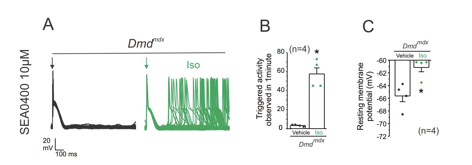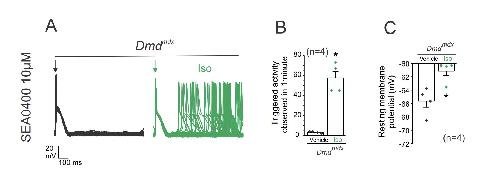 Fig S2. Na+/Ca2+ exchanger (NCX) inhibition does not prevent Iso-induced triggered activity in Dmdmdx cardiomyocytes. (A) Representative action potential traces of Dmdmdx isolated cardiomyocytes. Cells were stimulated with 1µM isoproterenol (Iso) in the presence of 10 µM SEA0400 a selective inhibitor of NCX. Arrow indicates electrical stimulation pulse. B) Quantification of TA observed in conditions shown in (A). The number in parentheses indicates the n value. Comparisons between groups were made using Student´s t-test, *P<0.05 vs Vehicle. C) Resting membrane potential of Dmdmdx cardiomyocytes. The number in parentheses indicates the n value. Comparisons between groups were made using Student´s t-test, *P<0.05 vs vehicle |