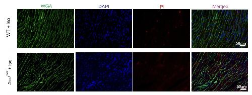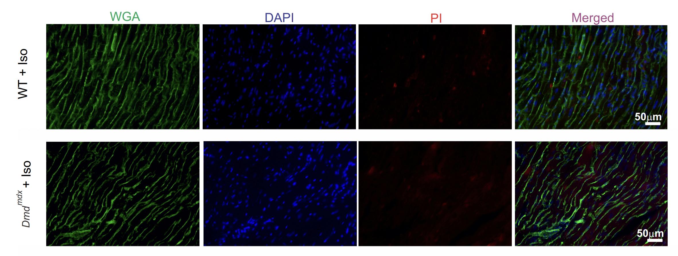 Fig S3. WT and in Dmdmdx 992 hearts do not show PI uptake after mice were treated with Iso. Representative images of isolated hearts perfused with Tyrode buffer containing 50 μM PI after treatment with Iso (5mg/kg, IP). Cryosections were stained with wheat germ agglutinin (WGA, green) and nuclei were stained blue with DAPI mounting reagent. Representative images of n = 3 per group. |