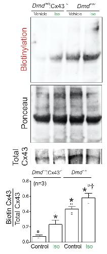 Fig S4. DmdmdxCx43+/- cardiomyocytes display a lower level of laterally localized Cx43 thanDmdmdx. A) Western blot analysis (top) and quantification (graph) of Cx43 from biotin perfused hearts (biotinylation). Bottom row represents Cx43-immunoblotted samples from heart lysates prior to pulldown (total Cx43). Biotinylated Cx43 levels were expressed as fold change relative to total Cx43 protein levels per sample. The number in parentheses indicates the n value. Comparisons between groups were made using two-way ANOVA plus Tukey post-hoc test. *P<0.05 vs Control Dmdmdx: Cx43(+/-), †<0.05 vs Dmdmdx. |