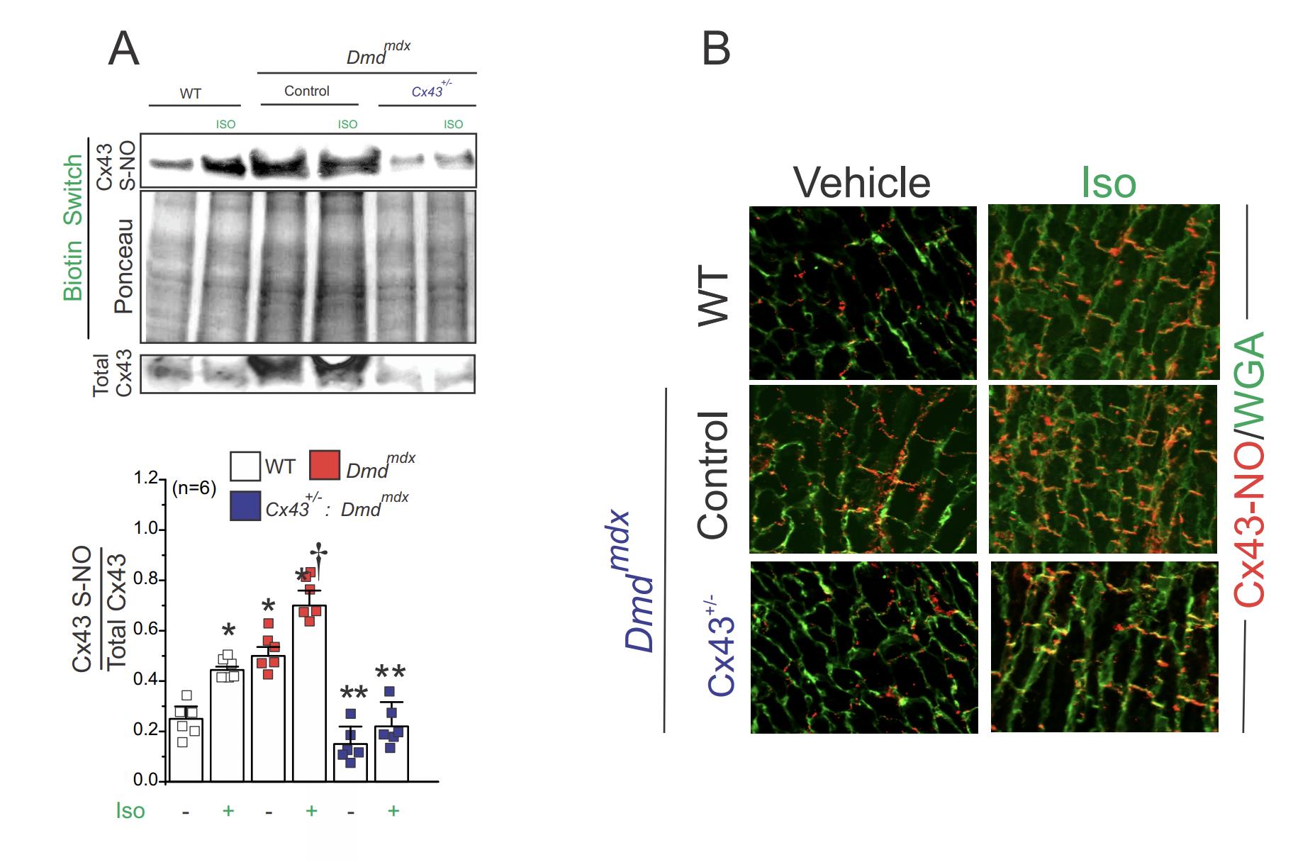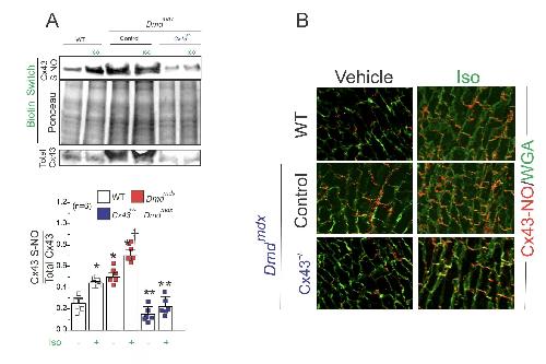 Fig S5. Dystrophic hearts with lower levels of Cx43 prevent the Iso-induced S-nitrosylated levels of Cx43. A) Top: Western blot detection of Cx43 and Middle: Ponceau staining of samples subjected to the biotin switch assay. Lower: Western blot detection of Cx43 in total cardiac protein lysates. Graph: quantification of 6 independent blots using the ratio of SNO-Cx43/Total. Comparisons between groups were made using two-way ANOVA plus Tukey post-hoc test. *P<0.05 vs WT control,†<0.05 vs WT Iso, **<0.05 vs Dmdmdx. B) Proximity Ligation assay (PLA) of Cx43 and Snitrosylation in heart sections of WT, Dmdmdx and Dmdmdx: Cx43 1015 (+/-) mutants. Detection of Wheat germ agglutinin (WGA) (green) and S-nitrosylated Cx43 (Cx43-SNO) (red), respectively. Representative images of n = 4 per group. |