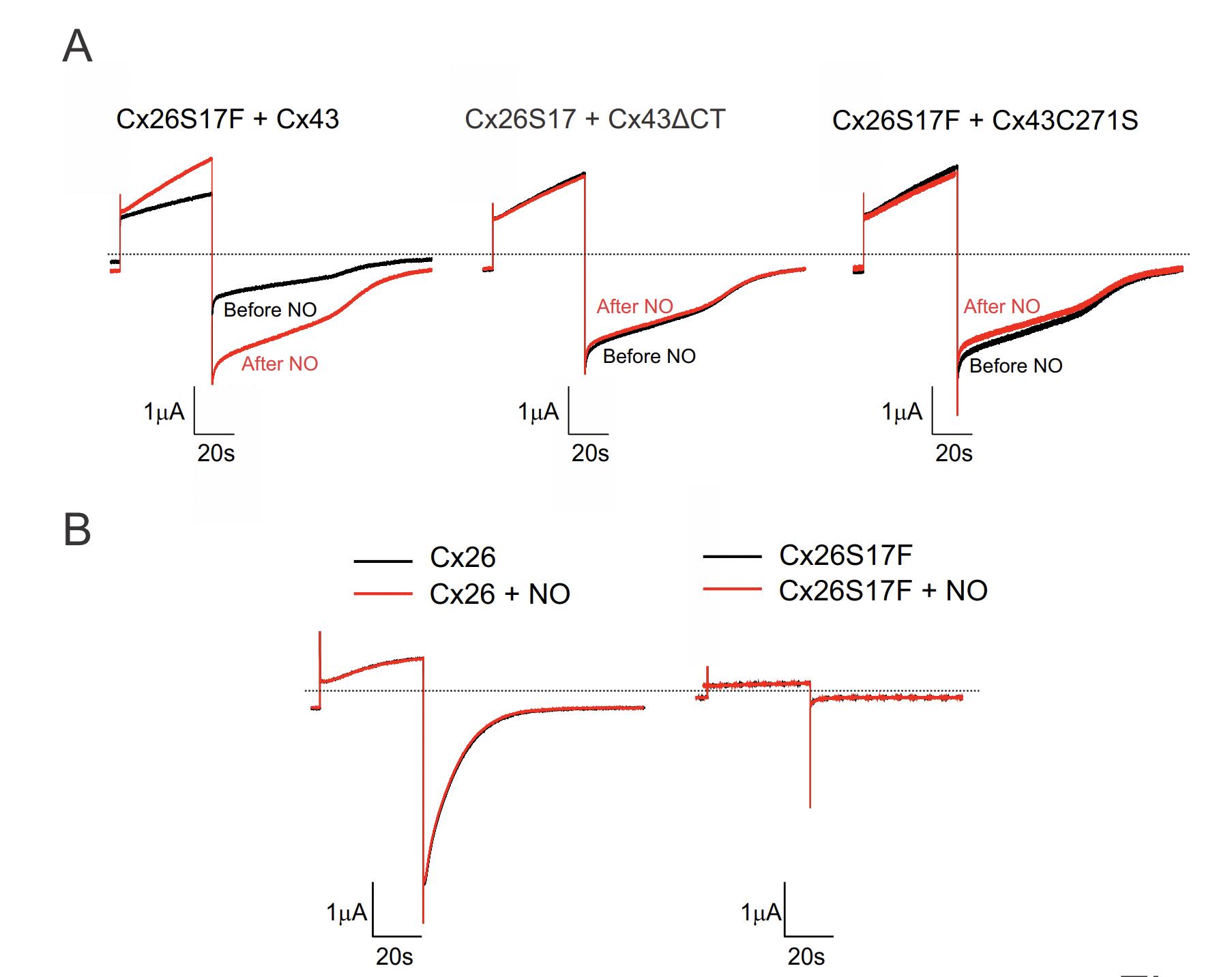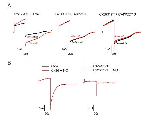 Fig S6. Cx43 variants carrying a carboxyterminal truncation or a C271S mutation do not affect gating when co-expressed as heteromeric channel with Cx26S17F. (A) Representative current traces elicited by a voltage pulse from -80 to 0 mV from oocytes expressing heteromeric channels formed by full length, CT truncated Cx43 or Cx43C271S with Cx26S17F. Black and red traces correspond to voltage activated hemichannel currents in the absence or presence of 10 μM DEENO, respectively. Representative traces of n = 9 per group. (B) Nitric oxide did not activate homomeric Cx26 and Cx26S17F hemichannels. Representative current traces elicited by a voltage pulse from -80 to 0 mV for an oocyte expressing Cx26 and Cx26S17F. Black and red traces correspond to voltage activated hemichannel currents in the absence or presence of 10 μM DEENO, respectively. Representative traces of n = 6 per group. |