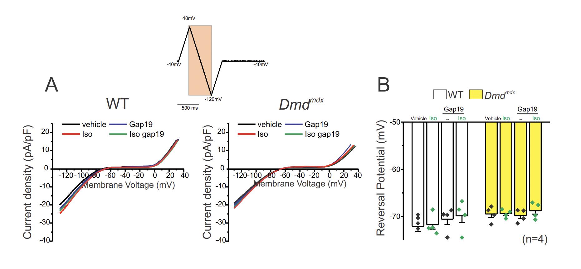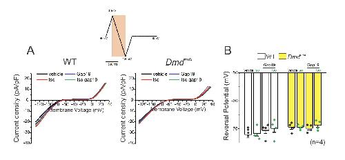 Fig. S7. WT, Dmdmdx cardiomyocytes display similar K+ currents. A) Representative current traces before and after application of 100 μM Gap19 and/or 1μM Iso in WT and Dmdmdx isolated cardiac cells. K+ currents were measured using the orange section detected during a ramp protocol. A negative ramp (from +40 to -120 mV) was used to prevent activating the voltage-gated sodium channel. B) Quantification of reversal membrane potential detected in conditions shown in (A). The number in parentheses indicates the n value. |