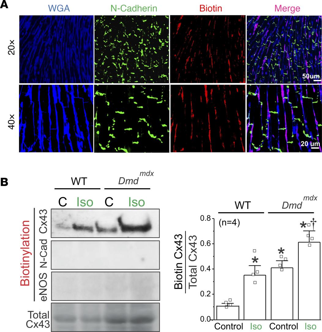 Figure 2 Biotin perfused in intact hearts interacts only with plasma membrane of cardiomyocytes at the lateral side. (A) Representative immunofluorescence against N-cadherin (green) and biotin (red) in a Dmdmdx heart sample. Biotin was perfused for 60 minutes before heart fixation. Cryosections were stained with wheat germ agglutinin (WGA, blue). Note that biotin was positively stained only at the lateral borders of cardiomyocytes and not at intercalated discs. (B) Western blot analysis and quantification of Cx43 from biotin-perfused hearts (biotinylation). Bottom row represents Cx43-immunoblotted samples from heart lysates prior to pulldown (total Cx43). Biotinylated Cx43 levels were expressed as fold change relative to total Cx43 protein levels per sample. Note that biotin did not interact with intracellular proteins (eNOS) and intercalated disc proteins (N-cadherin). The number in parentheses indicates the n value. Comparisons between groups were made using 2-way ANOVA plus Tukey’s post hoc test. *P < 0.05 vs. WT control; †P < 0.05 vs. Dmdmdx control. |