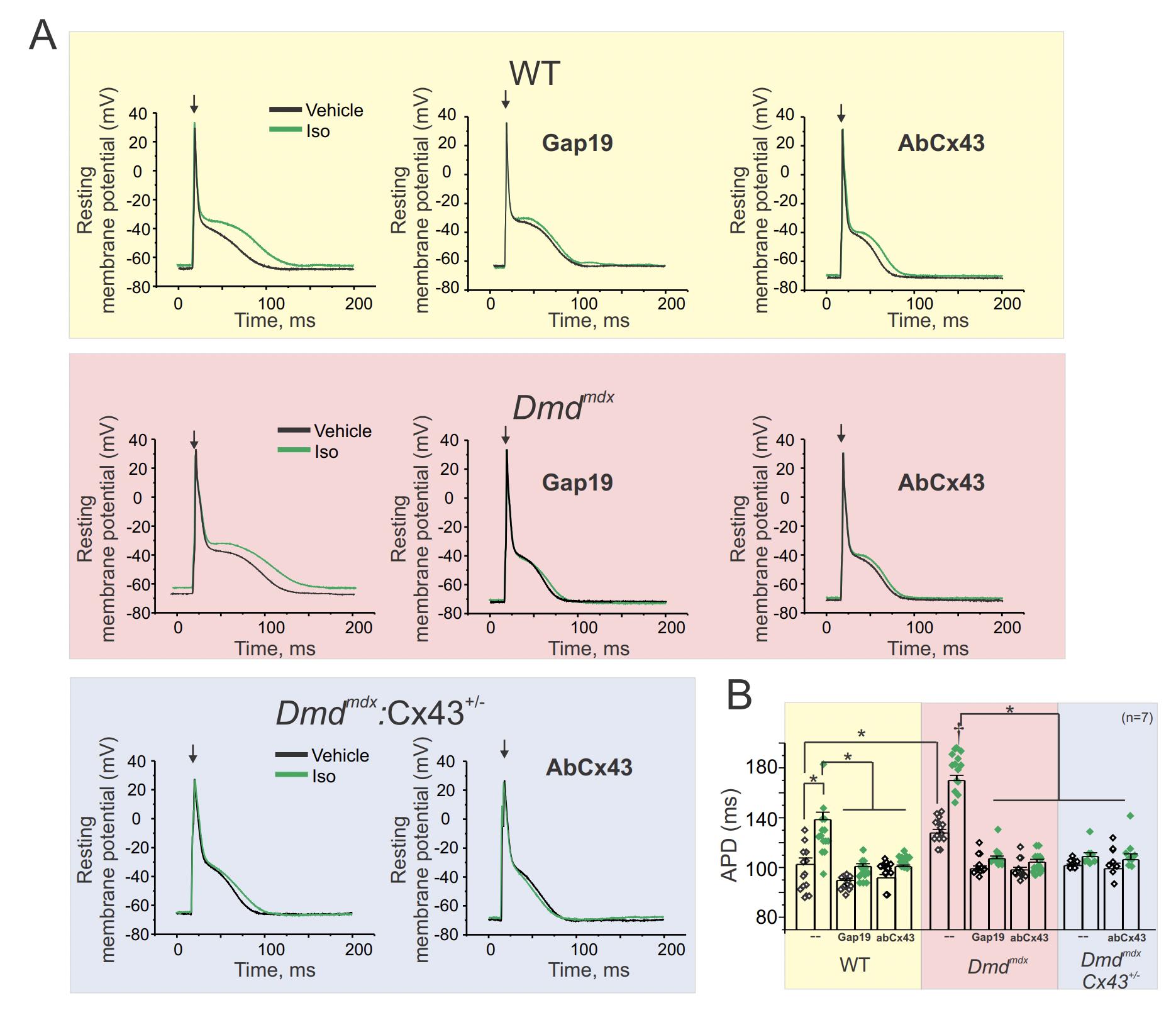 Fig S8. Cx43 hemichannels are involved in the prolongation of APD in WT and dystrophic cardiomyocytes upon isoproterenol treatment. A) Representative action potential traces of WT, Dmdmdx and DmdmdxCx43+/- isolated cardiomyocytes. Cells were stimulated with 1µM isoproterenol (Iso) in the absence or presence of Cx43 blockers contained inside the pipette: Gap19 (232ng/µL) and Cx43 CT antibody (abCx43; 2.5ng/µL). Arrows represent electrical stimulation. Note that Dmdmdx isolated cardiomyocytes have extended APD compared to WT and DmdmdxCx43+/- isolated cardiac cells. B) Quantification of APD observed in (A). The number in parentheses indicates the n value. Comparisons between groups were made using two-way ANOVA test plus Tukey post-hoc test. *P<0.05, † <0.05 vs WT isoproterenol. |