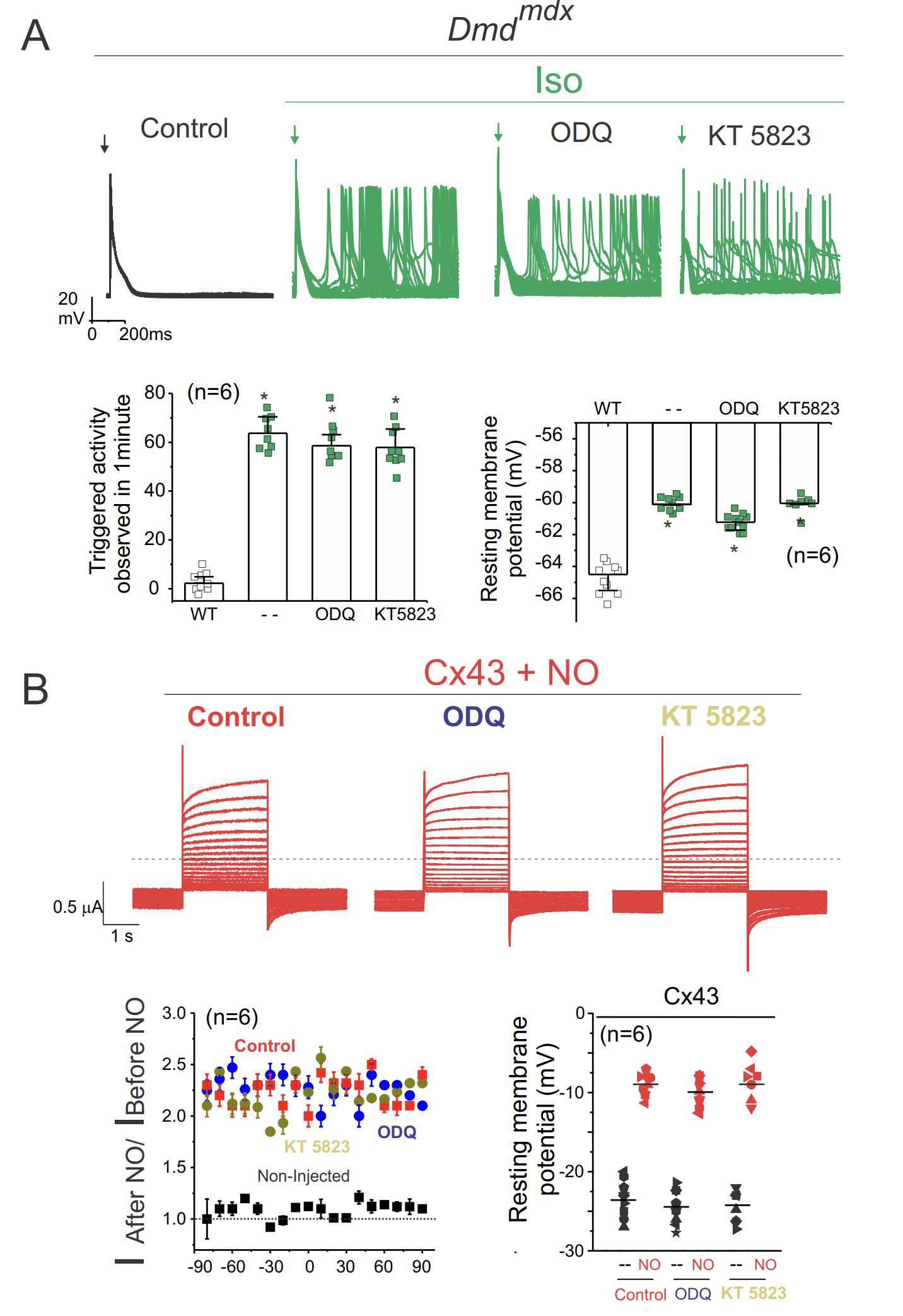Fig S9. Nitric oxide canonical pathway (cGMP-PKG) does not mediate TA in isolated cardiomyocytes and Cx43 hemichannels activation. A) Representative action potentials traces from Dmdmdx 1051 isolated cardiomyocytes. Cells were stimulated with 1μM Iso in the absence or presence of ODQ (a highly selective, irreversible, inhibitor of soluble guanylyl cyclase) or KT 5823 (selective protein kinase G inhibitor) contained inside the pipette: ODQ (3 µM) and KT 5823 (1 µM). Arrow indicates electrical stimulation pulse. Note that both inhibitors ODQ and KT 5823 did not affect the TA and the Vm induced by Iso stimulation. The number in parentheses indicates the n value. Comparisons between groups were made using two-way ANOVA plus Tukey post-hoc test *P<0.05 vs WT. B) Representative current traces after application of 10 μM DEENO in an oocyte expressing Cx43 in the absence or presence of intracellular injections of ODQ (3 µM final intracellular concentration) and KT 5823 (1 µM final intracellular concentration). Oocytes were clamped to −80 mV, and square pulses from −80 mV to +90 mV (in 10 mV steps) were then applied for 2s. Normalized currents were obtained from the ratio between recorded current after and before DEENO treatment. Note that soluble guanylyl cyclase and protein kinase G inhibition did not significantly affect NO-induced hemichannel currents in oocytes expressing Cx43. |