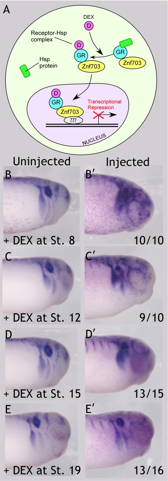 Znf703 is an RAR- and Wnt-inducible transcription factor that exhibits a complex expression pattern in the developing embryo: Znf703 mRNA is found in the early circumblastoporal ring, then later throughout the neural plate and its border, and subsequently in the mid/hindbrain and somites. We show that Znf703 has a different and separable function in early mesoderm versus neural crest and placode development. Independent of its early knockdown phenotype on Gdf3 and Wnt8, Znf703 disrupts patterning of distinct neural crest migratory streams normally delineated by Sox10, Twist, and Foxd3 and inhibits otocyst formation and otic expression of Sox10 and Eya1. Furthermore, Znf703 promotes massive overgrowth of SOX2+ cells, disrupting the SoxB1 balance at the neural plate border. Despite prominent expression in other neural plate border-derived cranial and sensory domains, Znf703 is selectively absent from the otocyst, suggesting that Znf703 must be specifically cleared or down-regulated for proper otic development. We show that mutation of the putative Groucho-repression domain does not ameliorate Znf703 effects on mesoderm, neural crest, and placodes. We instead provide evidence that Znf703 requires the Buttonhead domain for transcriptional repression.