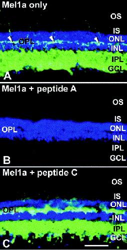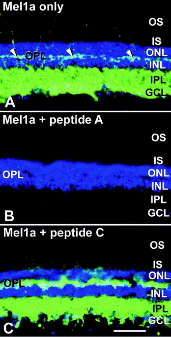 Immunocytochemistry of the X. laevis retina with Mel1a and Mel1c melatonin receptor antibodies. Fixed cryostat sections of Xenopus retina were incubated with the Mel1a receptor antibody or with antibody plus excess Mel1a or Mel1c peptide (controls). The primary antibody was labelled with a green fluorescent dyeâantibody conjugate, and counter stained with a blue nuclear dye. (A) Specific Mel1a immunolabelling is observed in the OPL (arrowheads), IPL, and GCL. The photoreceptor outer segments (OS) do not demonstrate specific immunolabelling. (B) Mel1a antibody pre-incubation with Mel1a antigen peptide blocks all specific immunoreactivity. (C) Mel1a antibody pre-incubation with Mel1c antigen peptide does not diminish Mel1a immunoreactivity. Scale bar represents 50 μm.