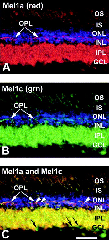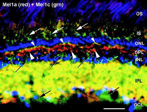 High magnification light micrograph merged image of the X. laevis retina double-labelled with Mel1a (red) and Mel1c (grn) antibodies. Mel1c immunoreactivity is present alone in the photoreceptor IS (white arrows), but not in the outer segments (OS). Also, Mel1c immunoreactivity is present alone in proximal regions of the OPL (black arrows), and in the ganglion cell soma (black arrows). Mel1a immunoreactivity is present alone in the distal portion of the OPL (large arrowheads). Co-localization of Mel1a and Mel1c immunoreactivity, as indicated by the yellow fluorescence, is present as a broad band in the IPL. There is also a small amount of yellow fluorescence in the distal portion of the OPL (small arrowheads), which may represent the close approximation of the photoreceptor synaptic terminals (green), and some horizontal cell processes (red). Scale bar represents 100 μm.