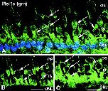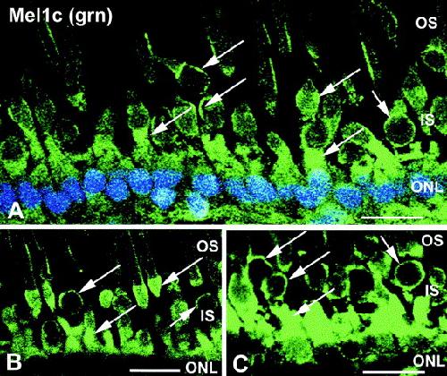 Confocal image of Mel1c immunoreactivity in the photoreceptor layers. Mel1c immunoreactivity is present in the photoreceptor inner segments (IS; arrows), but not in the outer segments (OS; the axoneme labelling is also seen in control sections). Also, Mel1c immunoreactivity is present in distal regions of the OPL directly adjacent to photoreceptor nuclei in the outer nuclear layer (ONL), and may represent photoreceptor synaptic terminals. The oblique orientation and cross sections of photoreceptor IS reveal the plasma membrane localization of the Mel1c receptor (arrows). In the IS, Mel1c labelling is exclusively present on the plasma membrane (arrows). The illusion of Mel1c immunoreactivity filling the IS is due to the thickness of the tissue sections, showing the immunoreactivity of the cell membrane as it spans the width of the IS. Scale bars represent 50 μm.