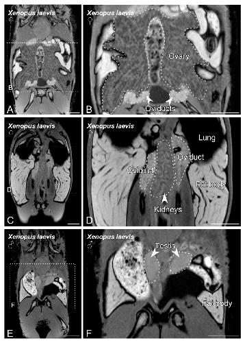 Figure 3. MRI slices selected to illustrate the main sex organs of the Xenopus laevis anurans. Images from (A) to (D) show the structures identified in a gravid Xenopus laevis female. Images (E,F) show testis and fat body in a Xenopus laevis male. The dashed lines in (A,C,E) indicate the magnification photos showed in (B,D,F). Scale bars = 1 cm. |